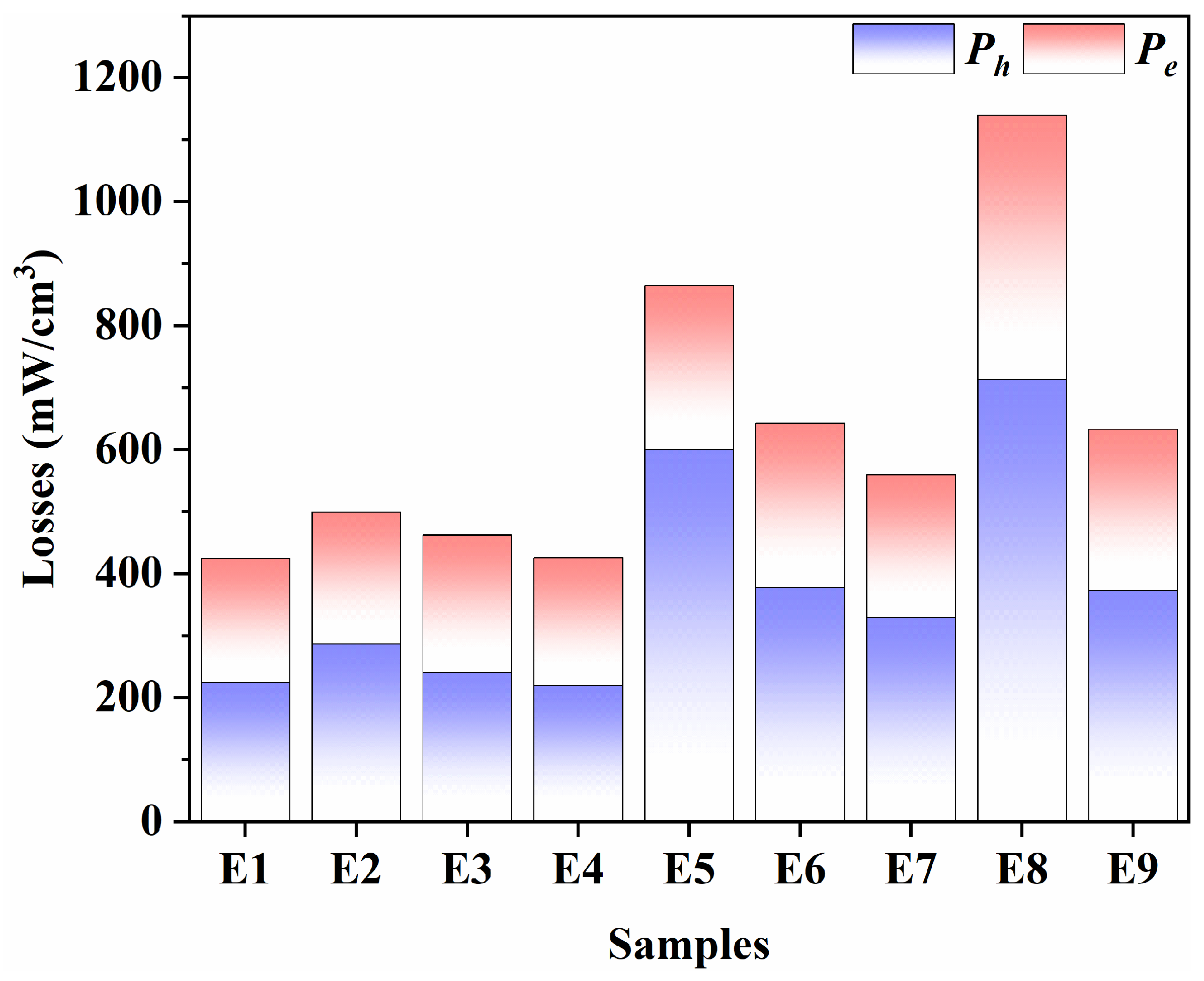 At the operating condition of this work (100 kHz/200 mT), loss separation was further performed for all samples (E1–E9) to clarify the origin of the variations in the total power loss