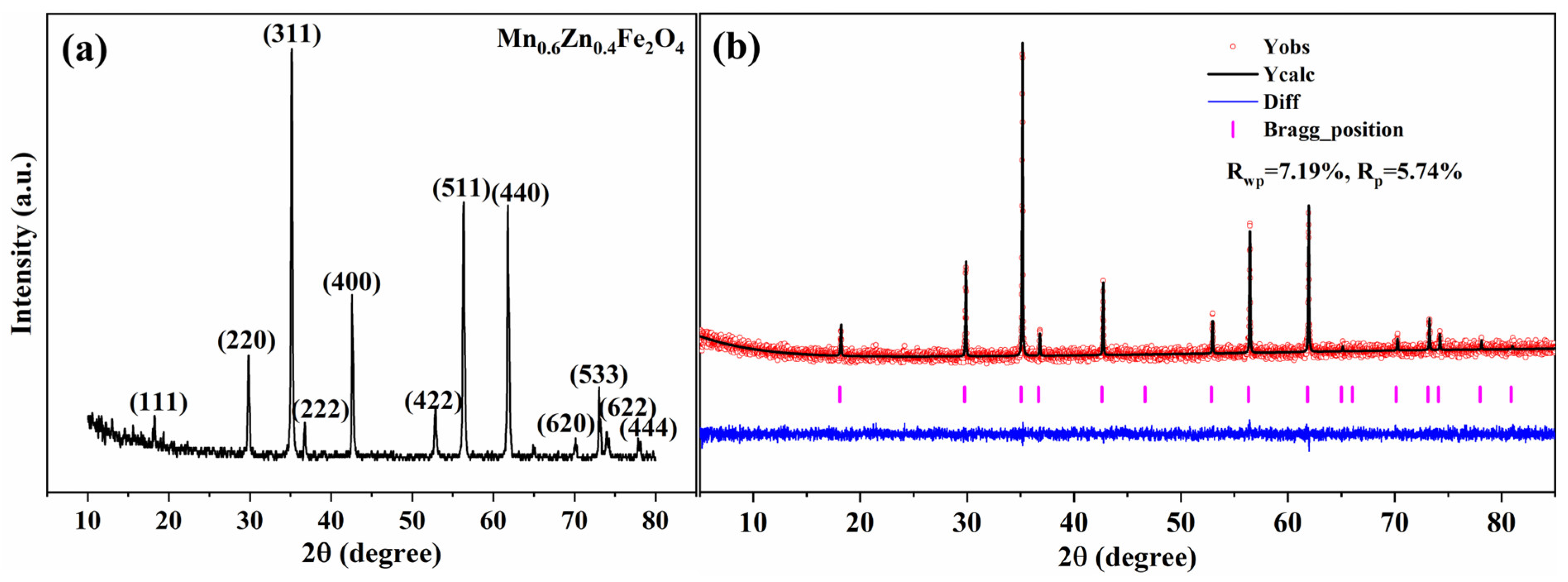 Figure 16c) show no obvious symmetry, and the maximum intensity values were below four, suggesting weak texture and predominantly random grain orientations, typical of polycrystalline ferrites [