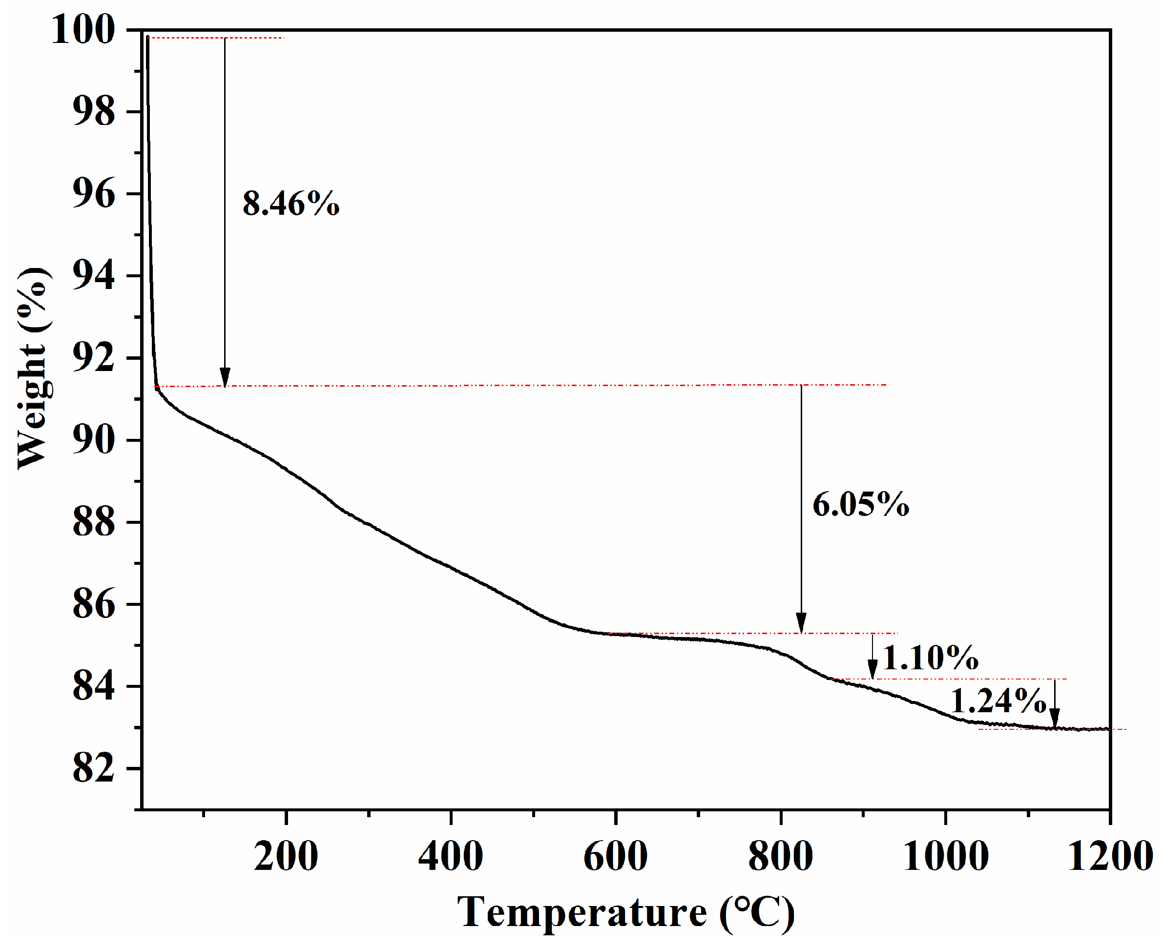 Figure 11). The sample exhibits a total mass loss of ~16.85%, which can be divided into four stages as indicated in