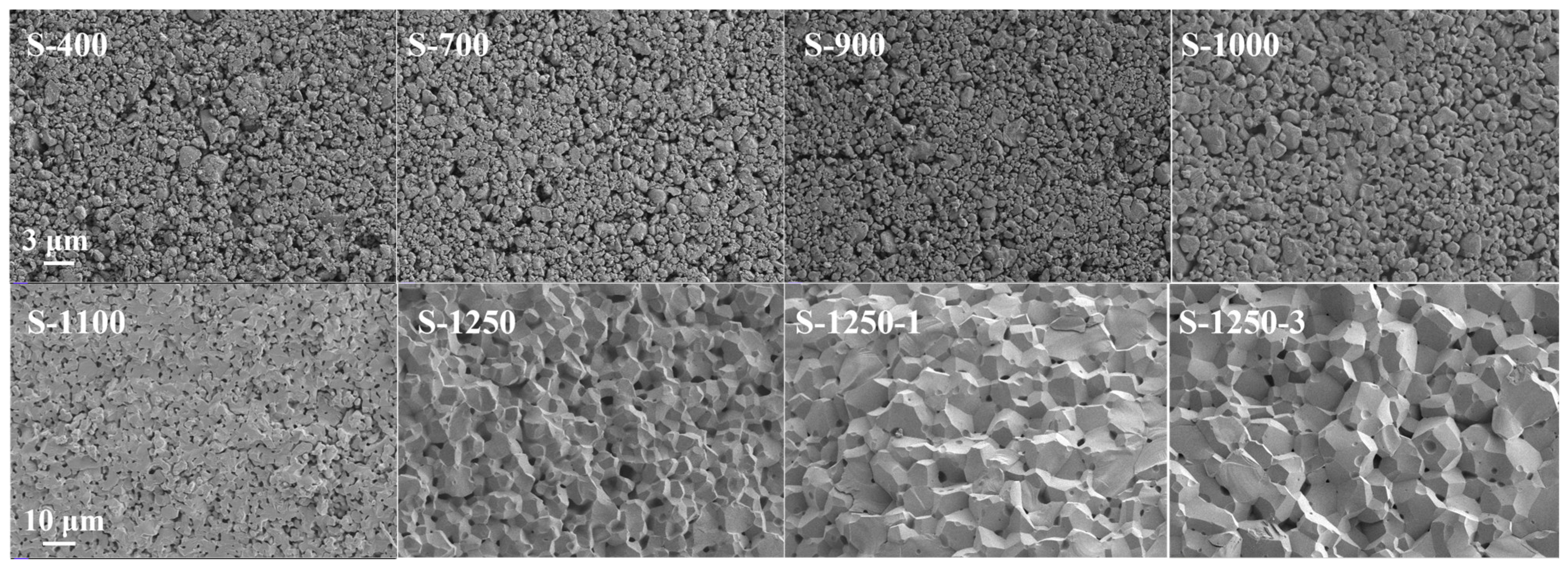 Figure 16 illustrates the microstructural evolution of samples subjected to the step-sintering experiment from a complementary perspective. Between 700 °C and 1250 °C, the process involved particle contact, merging, and the subsequent formation of new phases and grains. The microstructure evolved from a disordered state at 700 °C (S-700) to a more uniform configuration at 1250 °C (S-1250), with well-defined grain boundaries and improved grain morphology. This evolution is consistent with curvature-driven grain-boundary migration, where the reduction of total grain-boundary area/curvature provides the driving force for grain growth, leading to an overall decrease in grain-boundary energy. Furthermore, extended holding time promoted the exclusion of pores, as evidenced by the comparison between S-1250-1 and S-1250-3.