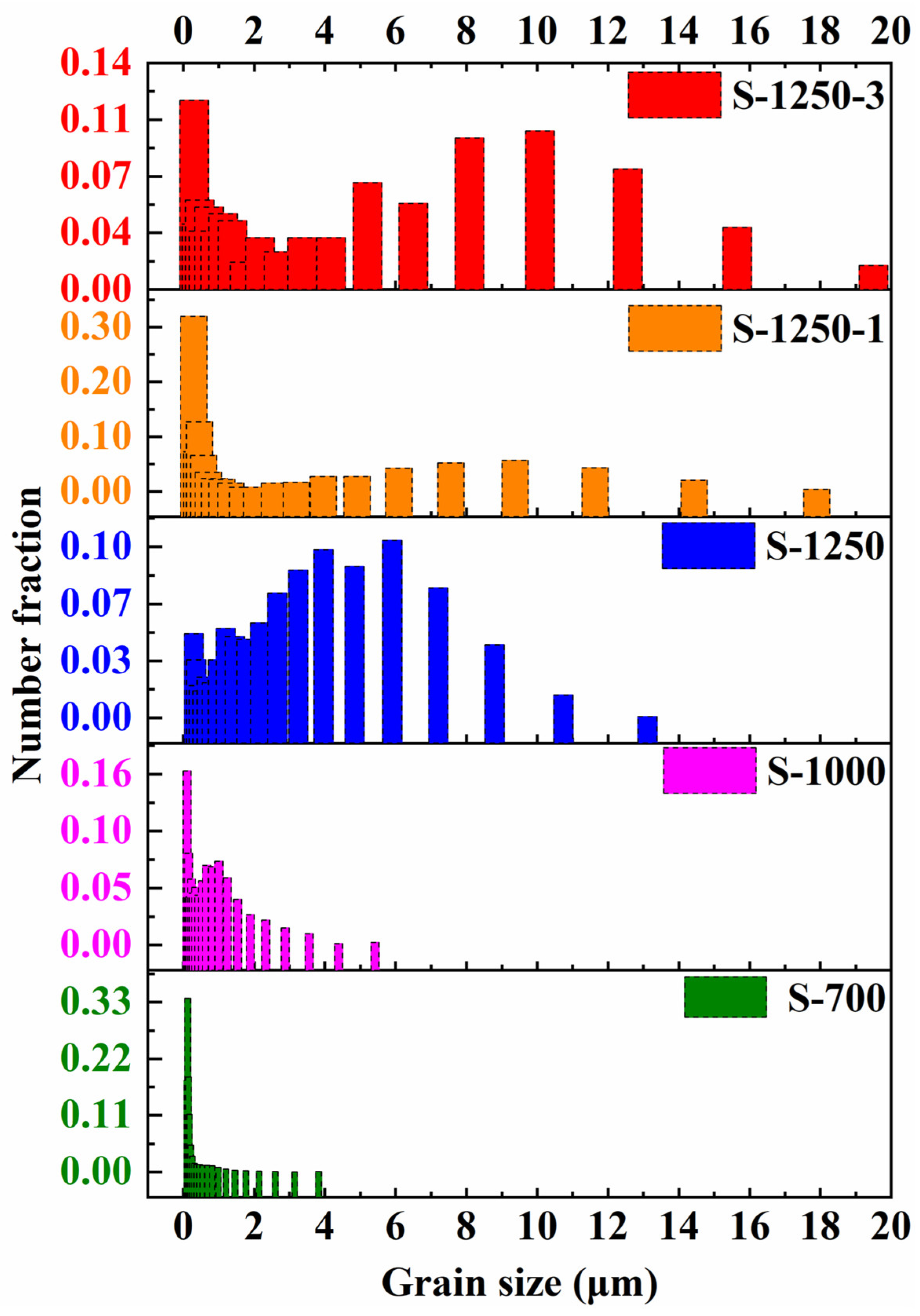 Figure 15), a remarkable difference in grain size and distribution was observed with increasing sintering temperature. For the sample sintered at 700 °C, the grain size was mainly concentrated below 2 µm. At 1000 °C, most grains remained under 2 µm; however, the fraction of extremely fine grains decreased, with more grains distributed over a broader size range. At 1250 °C, the average grain size increased markedly, with most grains falling within the range of 2–8 µm. During the subsequent holding stage, continuous grain growth occurred, and the disparity between small and large grains became more pronounced. With an extended holding time of 3 h, grains ranging from 5 to 13 µm accounted for a larger proportion as compared with those in the S-1250-1 sample, indicating further coarsening and microstructural homogenisation as sintering proceeds.