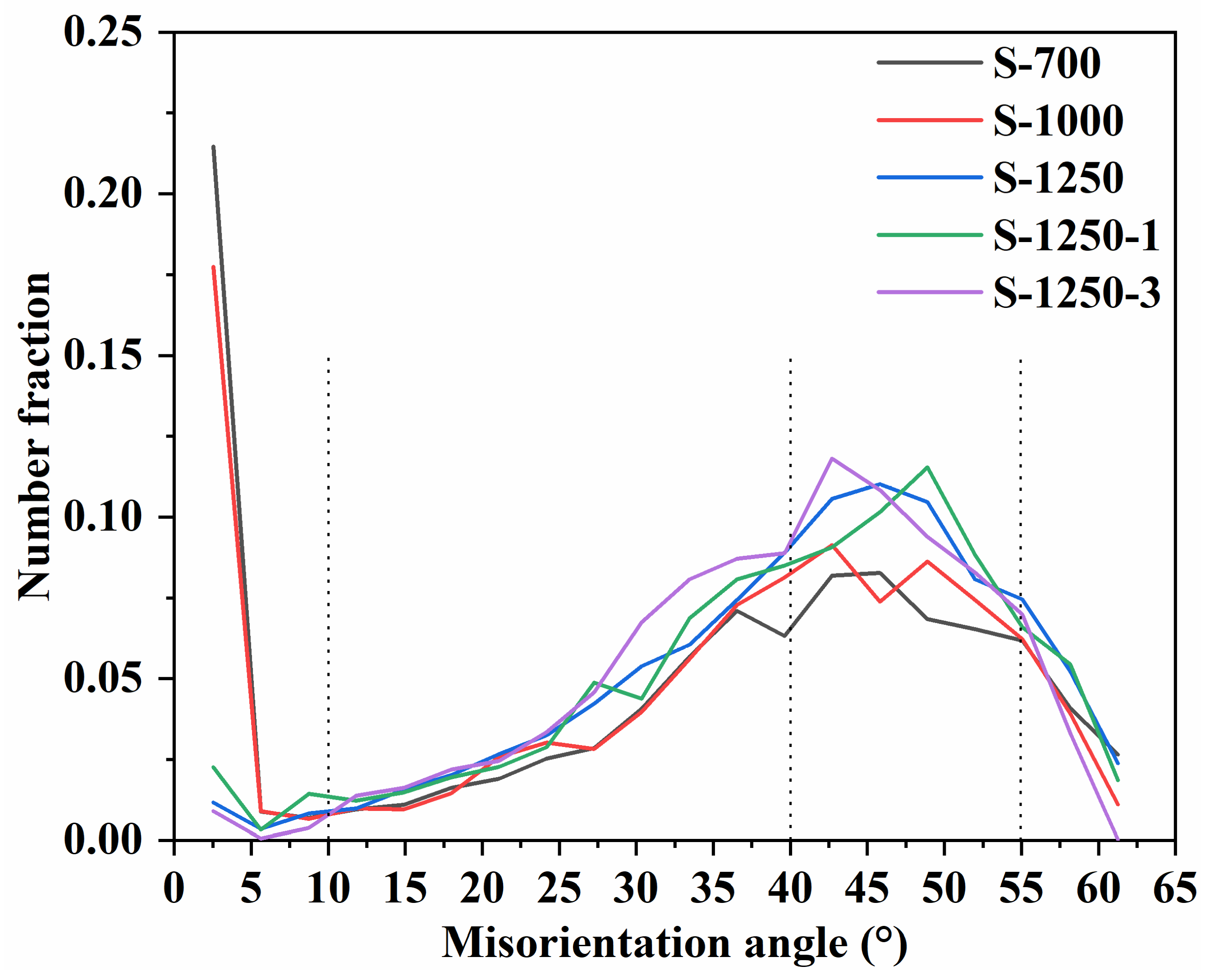 Figure 17 presents the misorientation angle distribution of samples sintered at different temperatures (S-700, S-1000, S-1250, S-1250-1, and S-1250-3). The samples at the intermediate stages (S-700 and S-1000) exhibited a high proportion of low-angle grain boundaries, with a pronounced peak below 10°, accompanied by several high-angle grain boundaries with peaks in the range of 40–55°. The predominance of low-angle grain boundaries at S-700/S-1000 is more reasonably associated with a sub-grain/dislocation-rich microstructure, rather than being directly assigned to a specific residual phase. Such low-angle boundaries are commonly related to dislocation arrays and therefore reflect higher stored strain energy. With increasing temperature, recovery and grain-boundary migration can reduce dislocation density and internal stress, thereby lowering the total interfacial energy and promoting microstructural stabilisation. Conversely, the existence of high-angle grain boundaries indicates the development of more mature grain boundaries as the ferrite microstructure progressively forms and coarsens, which agrees with the phase evolution identified by XRD in