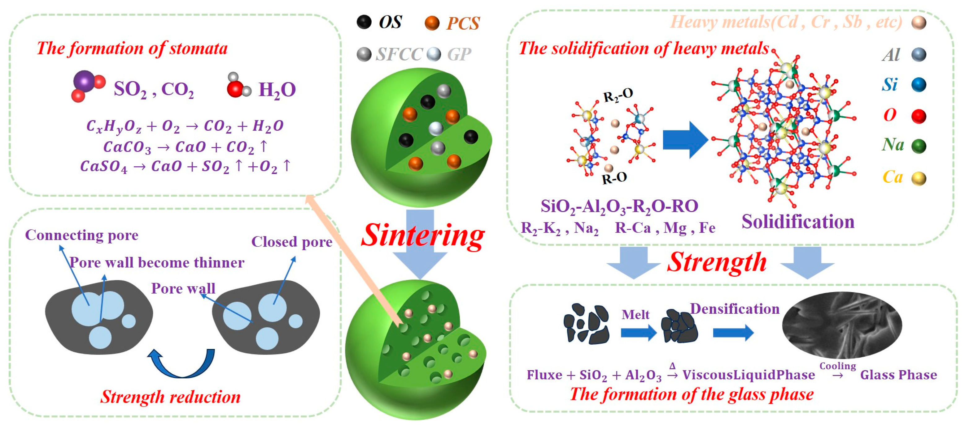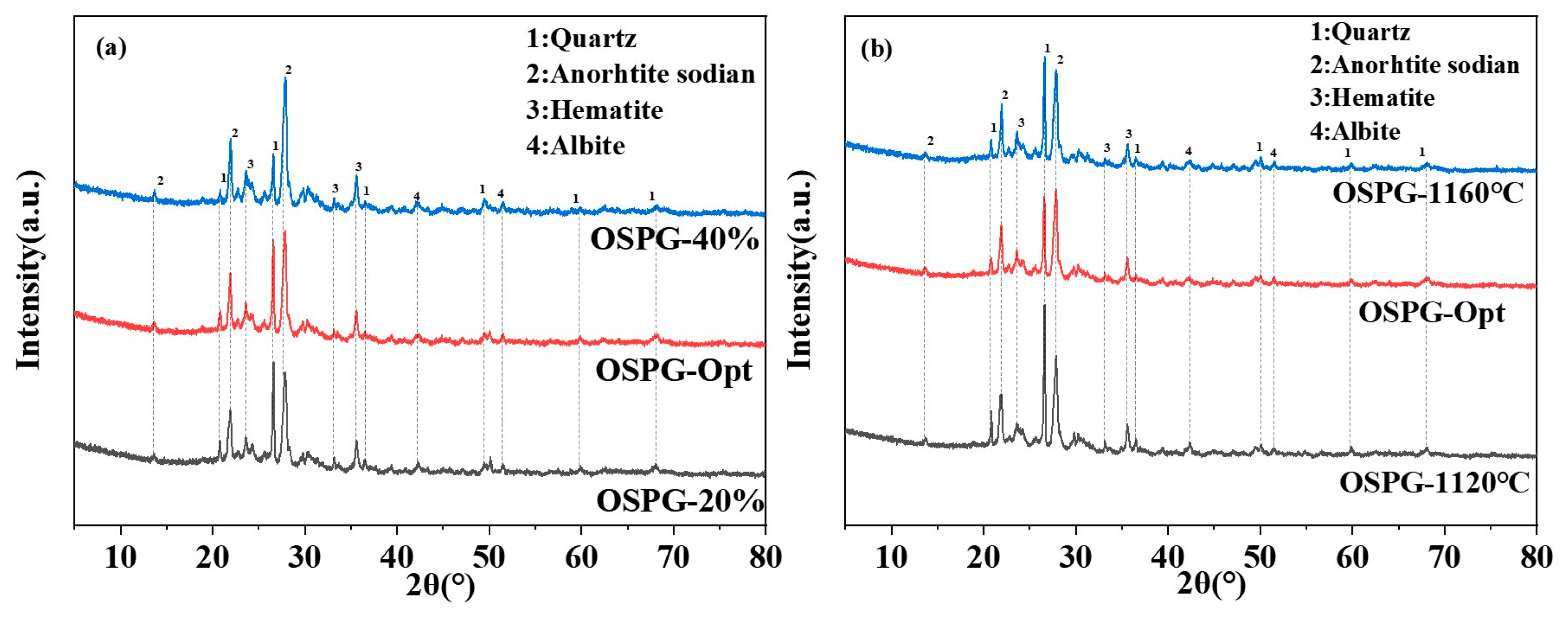 - Microstructural characterization identifies quartz, anorthite solid solution, hematite, and albite as key crystalline phases. Mechanical strength originates from an interlocking architecture between anorthite crystals and the glass matrix, promoted by MgO fluxing from decomposed olivine.