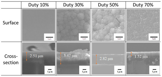 Surface and cross-sectional SEM images of films fabricated at different duty ratios.