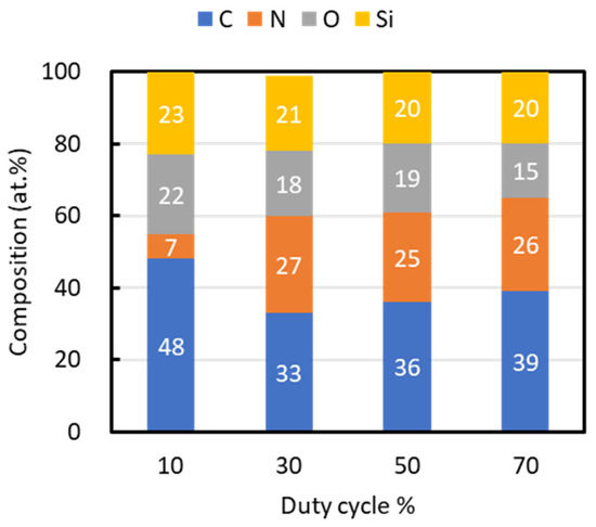 Figure 3 outlines the composition of films fabricated at each duty cycle. Carbon was the predominant element, with its highest content at a duty cycle of 10% being 48 at.%. All films contained approximately 20 at.% silicon. Nitrogen content was the lowest at a 10% duty cycle, at 7 at.%, while films deposited at higher duty cycles maintained nitrogen contents of approximately 26 at.%. Oxygen, observed in all samples, was attributed to a natural oxide film formed on the surface upon exposure to the atmosphere after deposition.
