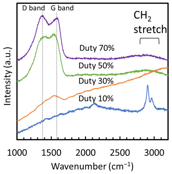 From the XRD patterns of the films, none of the films showed discernible peaks, confirming their amorphous structure devoid of crystalline forms of SiCN, SiC, Si3N4, or carbon materials such as diamond or graphite. Figure 4 displays the Raman spectra of films fabricated at various duty cycles. No peaks were observed in the wavenumber range of 1000 to 2000 cm−1 at a duty cycle of 10%, indicating the absence of carbon-related structures such as SiC, diamond, graphite, or diamond-like carbon, which typically exhibit peaks in this range. However, at 10% duty cycle, two peaks appeared at 2900 and 2970 cm−1, corresponding to the C–H stretching modes [17], indicating a significant hydrogen content in the film. In contrast, films deposited at duty cycles of 30% to 70% exhibited spectral characteristics of amorphous carbon, with peaks centered around the G (1580 cm−1) and D (1350 cm−1) bands [18]. The background in the spectrum showed a strong slope due to fluorescence at a duty cycle of 30%, which was notably less pronounced at 50% and 70%.