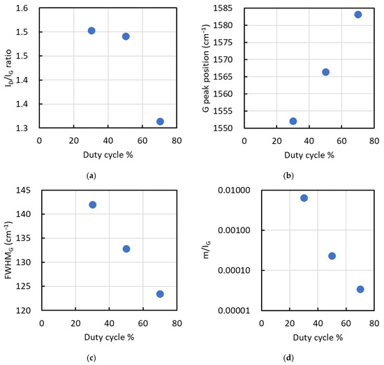 Results for (a) ID/IG ratio, (b) G peak position, (c) FWHM of the G peak, and (d) m/IG in the Raman spectra of films deposited at duty cycles of 30%, 50%, and 70%.