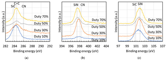 Figure 6 presents the XPS spectra [(a) Si 2p, (b) C 1s, and (c) N 1s] of films fabricated at different duty ratios, with spectral assignments based on literature data [21,22,23]. The Si 2p spectra [Figure 6a] showed peaks for Si–C (100.8 eV) and Si–N (101.9 eV). In the C 1s spectra [Figure 6b], peaks were observed for Si–C (283.7 eV), C=C (284.5 eV), and C=N (286.1 eV). The N 1s spectra [Figure 6c] displayed peaks for Si–N (397.4 eV) and C=N (398.3 eV).