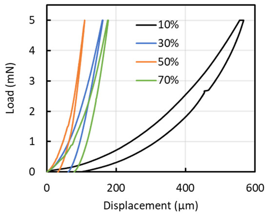 Representative load–displacement profiles from the nanoindentation tests for each condition.