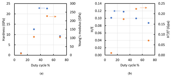 Relationship between duty cycle and various parameters such as (a) hardness (left y-axis) and Young’s modulus (right y-axis), and (b) H/E (left y-axis) and H³/E² (right y-axis). Arrows indicate the corresponding y-axes.