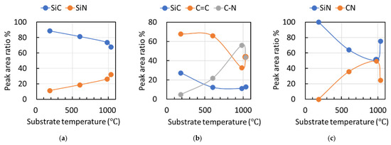 Presentation of the deconvoluted peak–area ratios derived from the XPS spectra shown in Figure 6, including (a) Si 2p, (b) C 1s, and (c) N 1s, for films fabricated at effective substrate temperatures.
