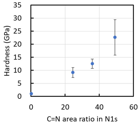 Hardness of films as a function of the CN bond content determined from their N1s XPS spectra.