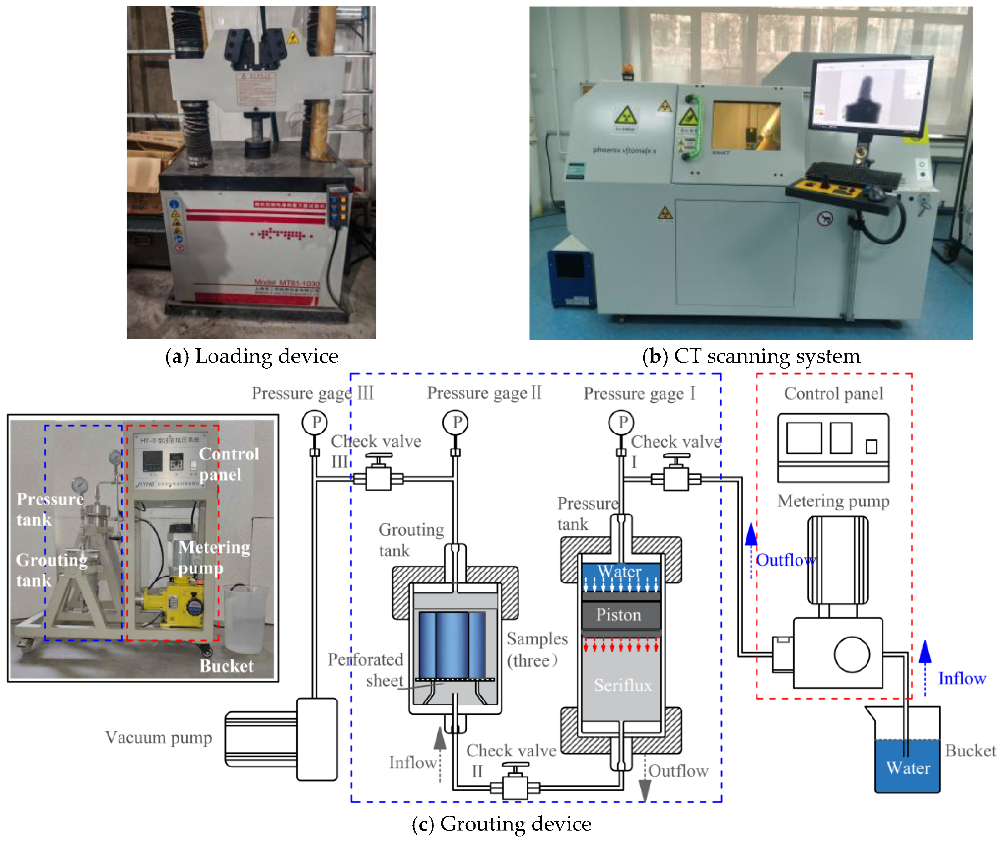 - Liu, S.; Cheng, Z.; Wang, H.; Bao, J. Experimental and numerical study on grouting reinforcement of a broken rock mass. Int. J. Geomech. 2025, 25, 4024357. [Google Scholar] [CrossRef]