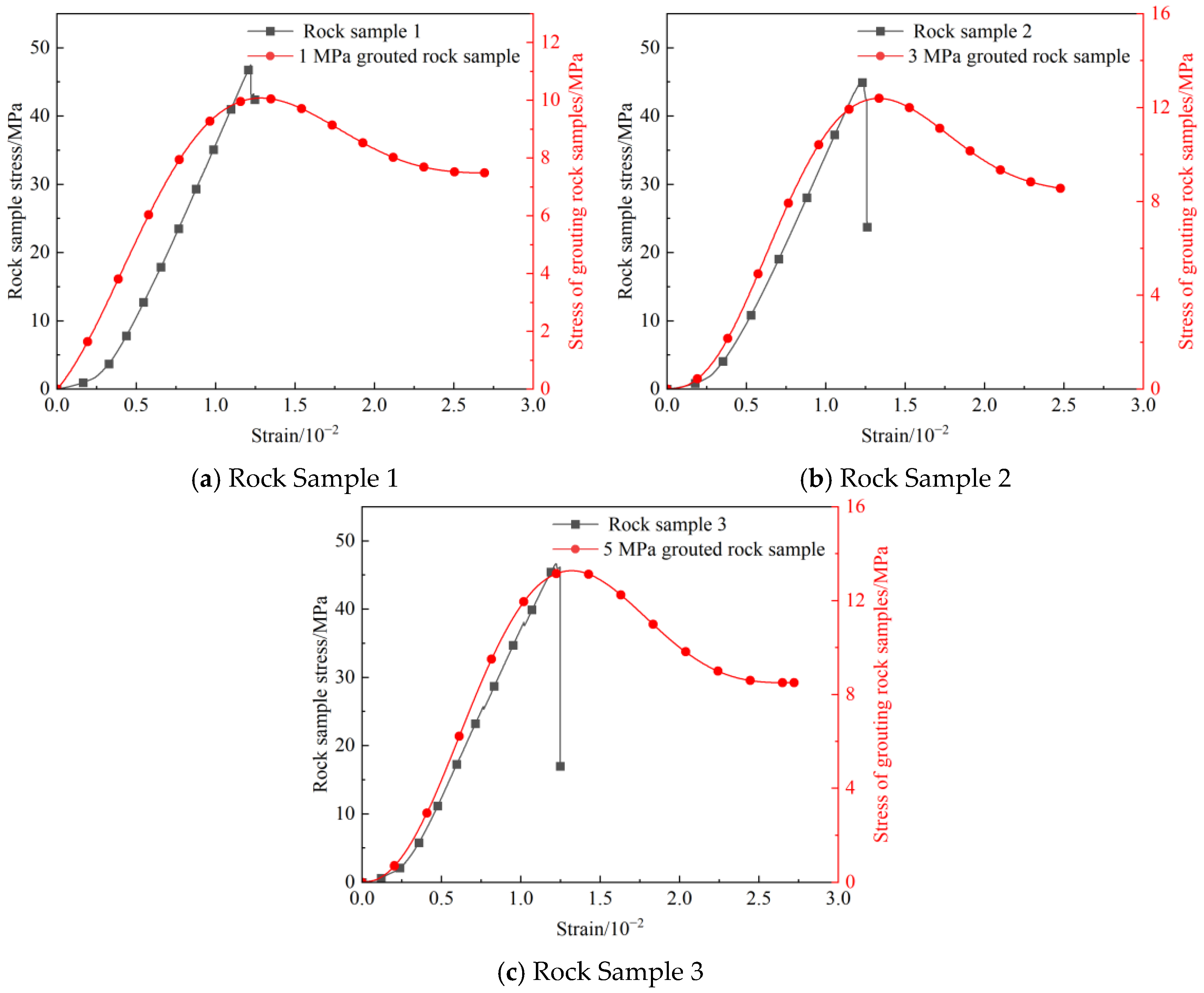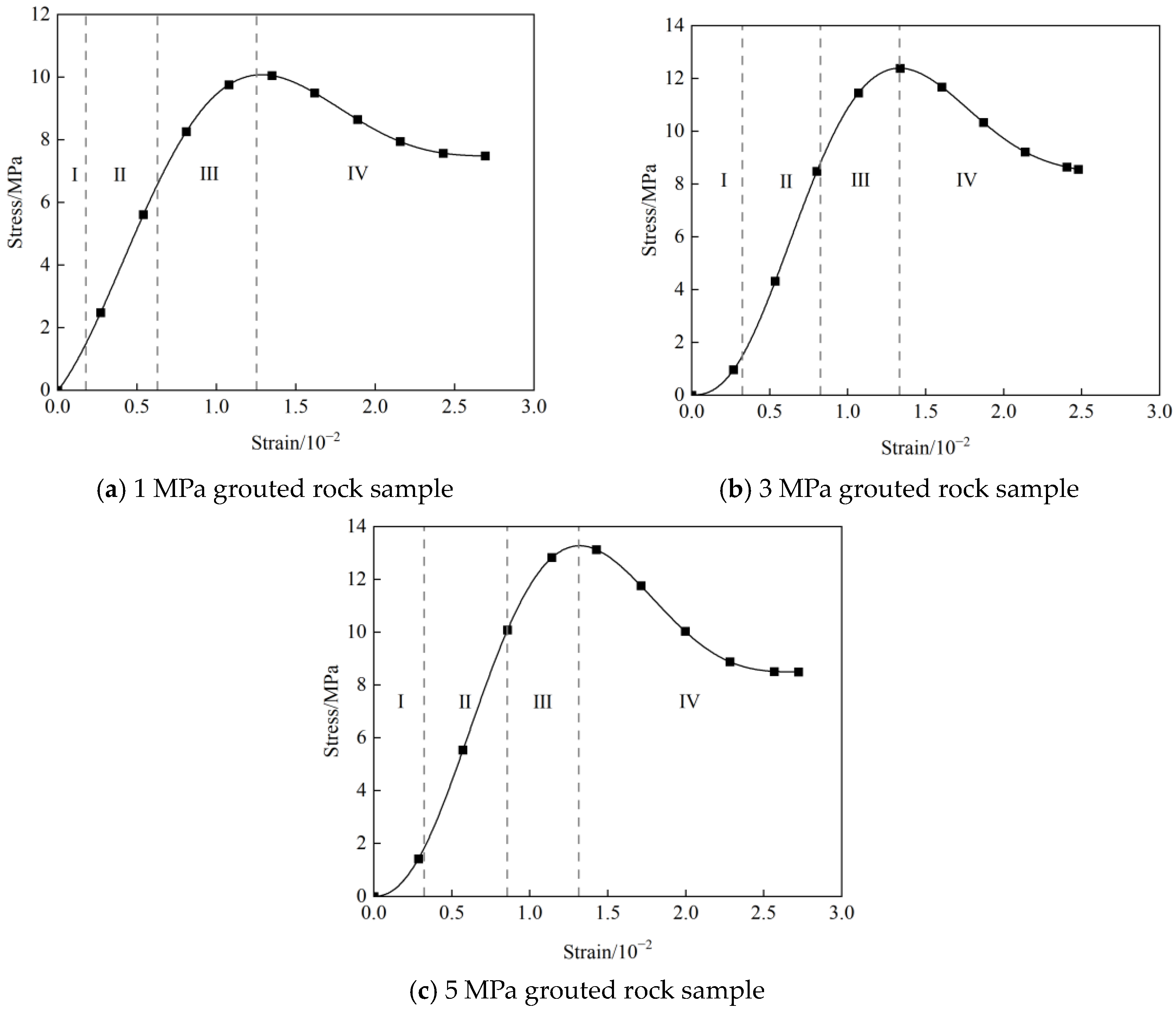 3.1. Stress–Strain Curves of Rock Samples Before and After Grouting