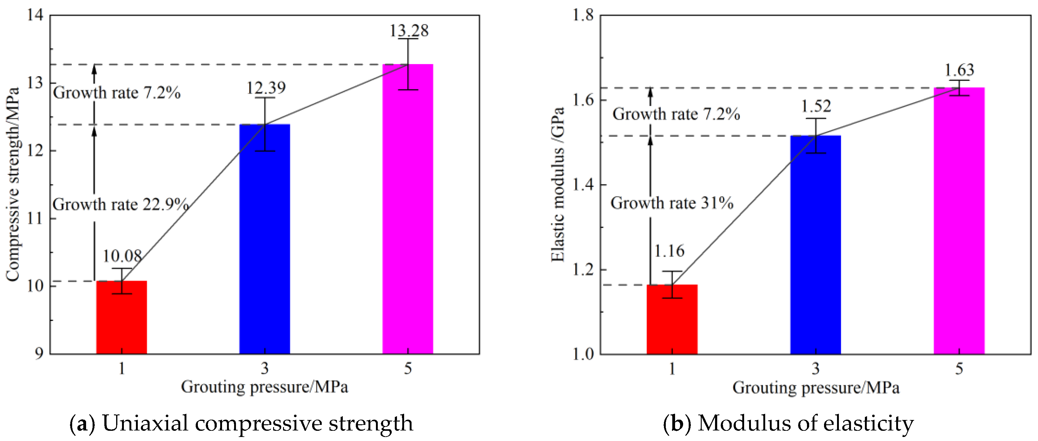 3.2. Compressive Strength and Elastic Modulus of Grouted Rock Samples