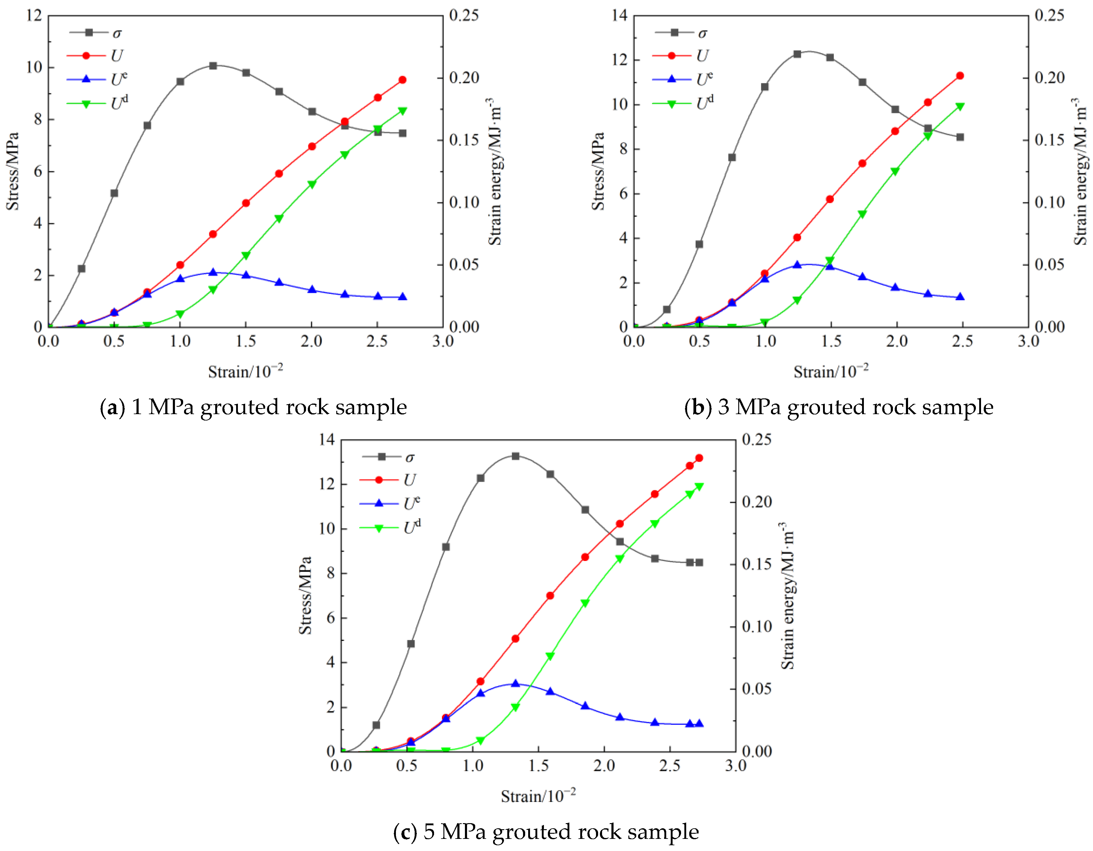 3.3. Energy Evolution During Compression of Grouted Rock Samples