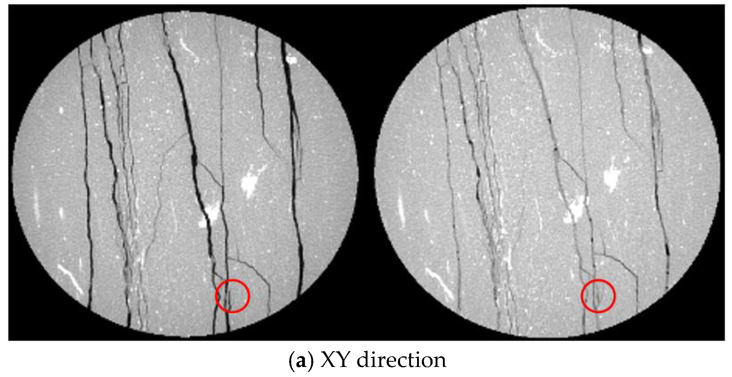 - Fu, J.; Li, X.; Qin, H.; Wang, S.; Liu, S.; Wang, Z.; Wu, Z.; Lou, Z. Experimental study on the crack propagation characteristics of drilled-slit and grouted rock samples based on CT three-dimensional scanning. Process Saf. Environ. Prot. 2025, 202, 107808. [Google Scholar] [CrossRef]