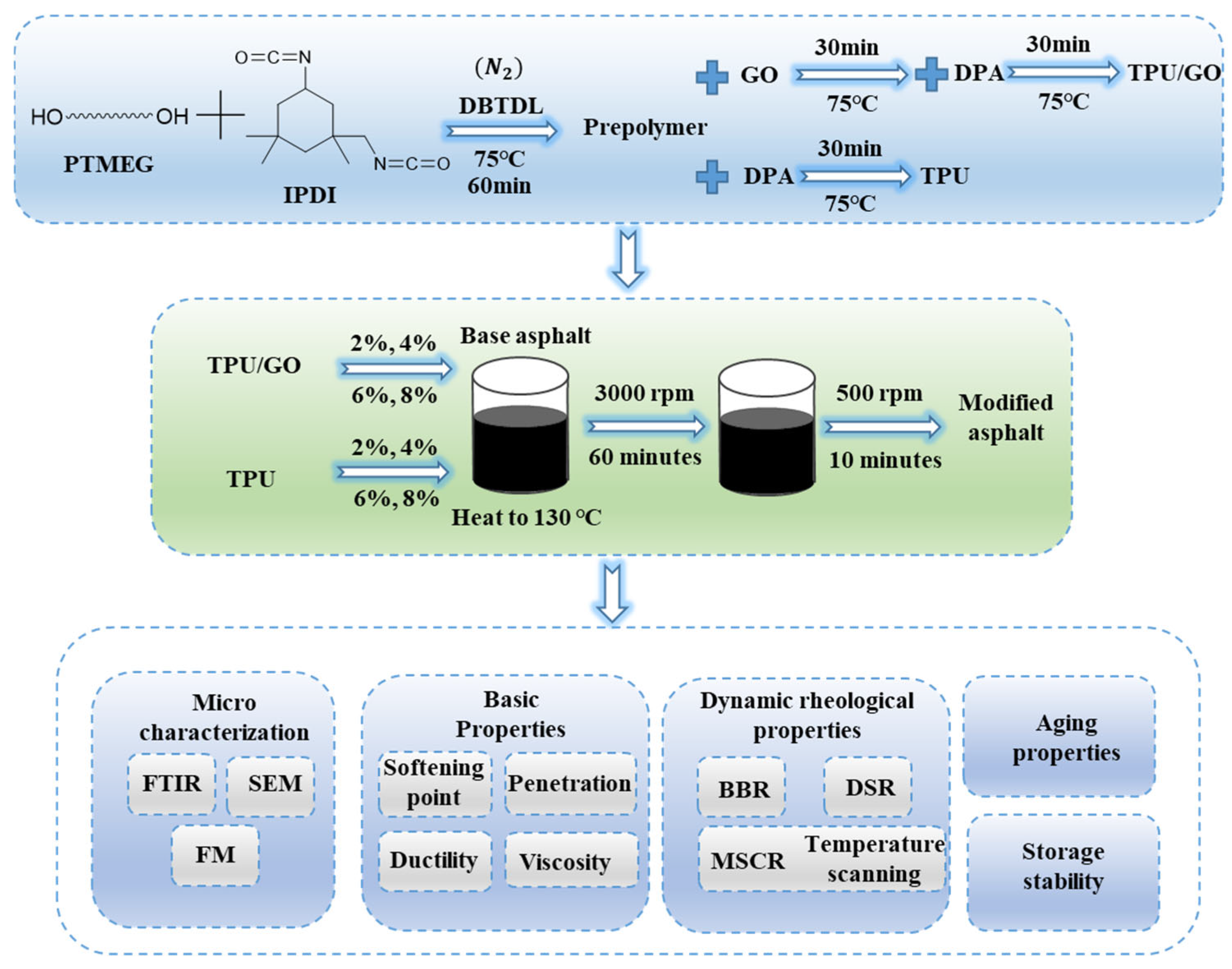 - Influence of other factors: The present study used only one type of base asphalt (70# pen asphalt) and fixed GO content (1.2%) in TPU/GO composites. The adaptability of TPU/GO modifiers to different types of base asphalt (e.g., 90# pen asphalt, hard asphalt) and different GO contents in TPU/GO composites for different asphalt types were not investigated.