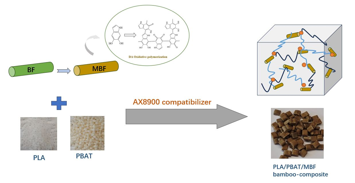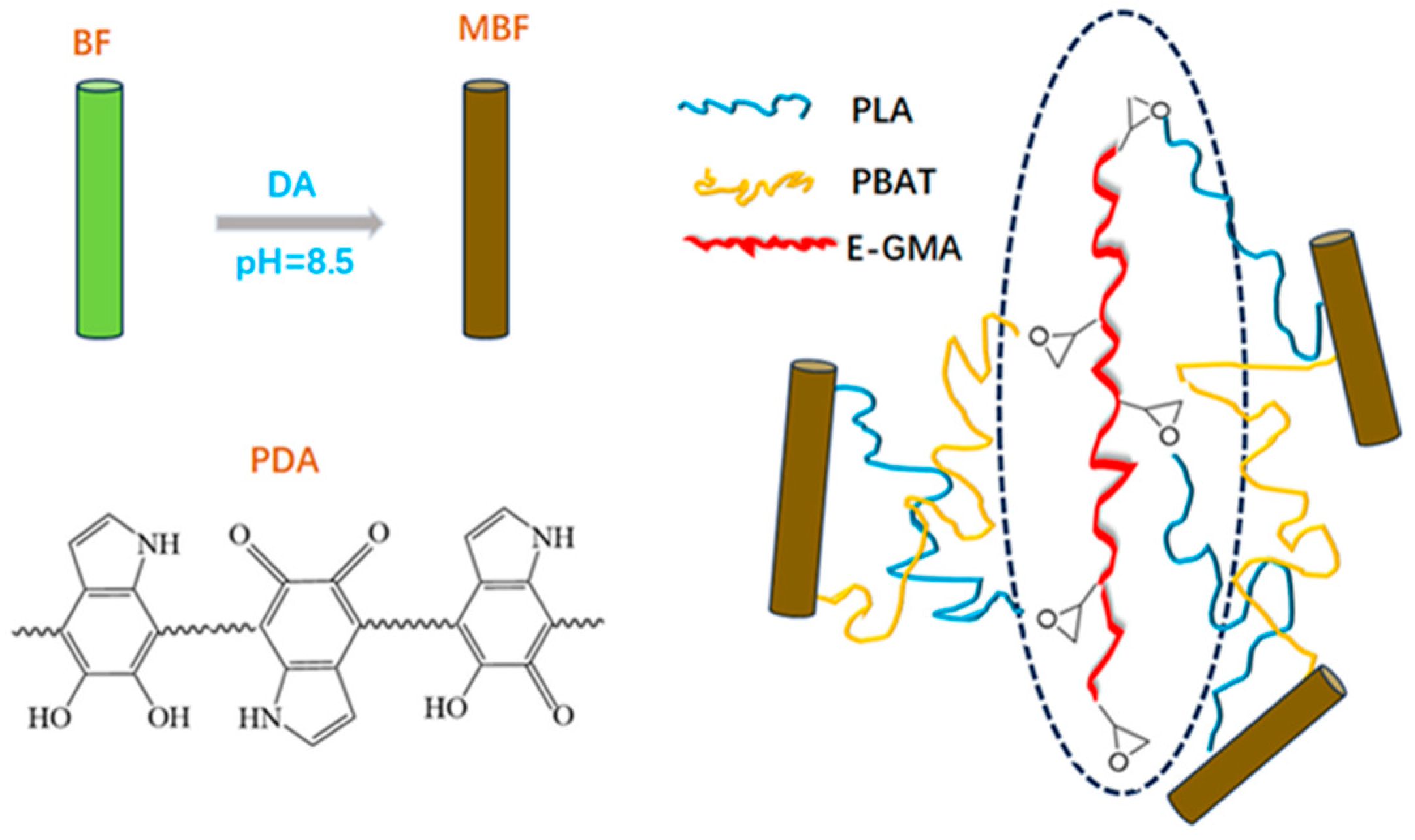 - Zhai, H.; Sun, B.; Ma, T.; Guo, H.; Zhang, C.; Ding, X.; Zhao, J.; Pan, B. Fabrication of modifed bamboo fiber/PLA/PBAT composite for interfacial compatibilization and toughening. J. Mater. Sci. 2026, 61, 3015–3029. [Google Scholar] [CrossRef]