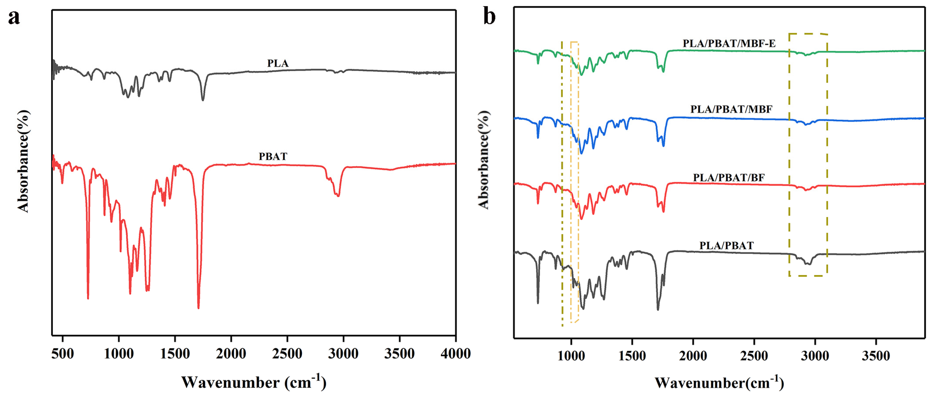 | PLA/PBAT | PLA/PBAT/BF | PLA/PBAT/MBF | PLA/PBAT/MBF-E | |