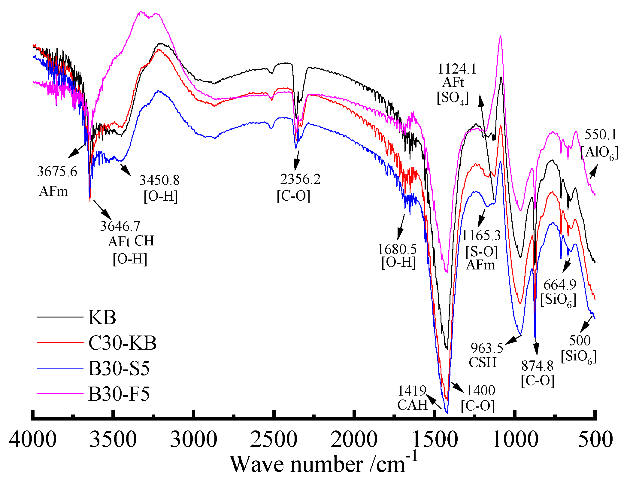 | FTIR | Fourier transform infrared spectroscopy | B30-S5 | Specimen containing 5% slag attacked by saturated sulfate solution in semi-immersion form |