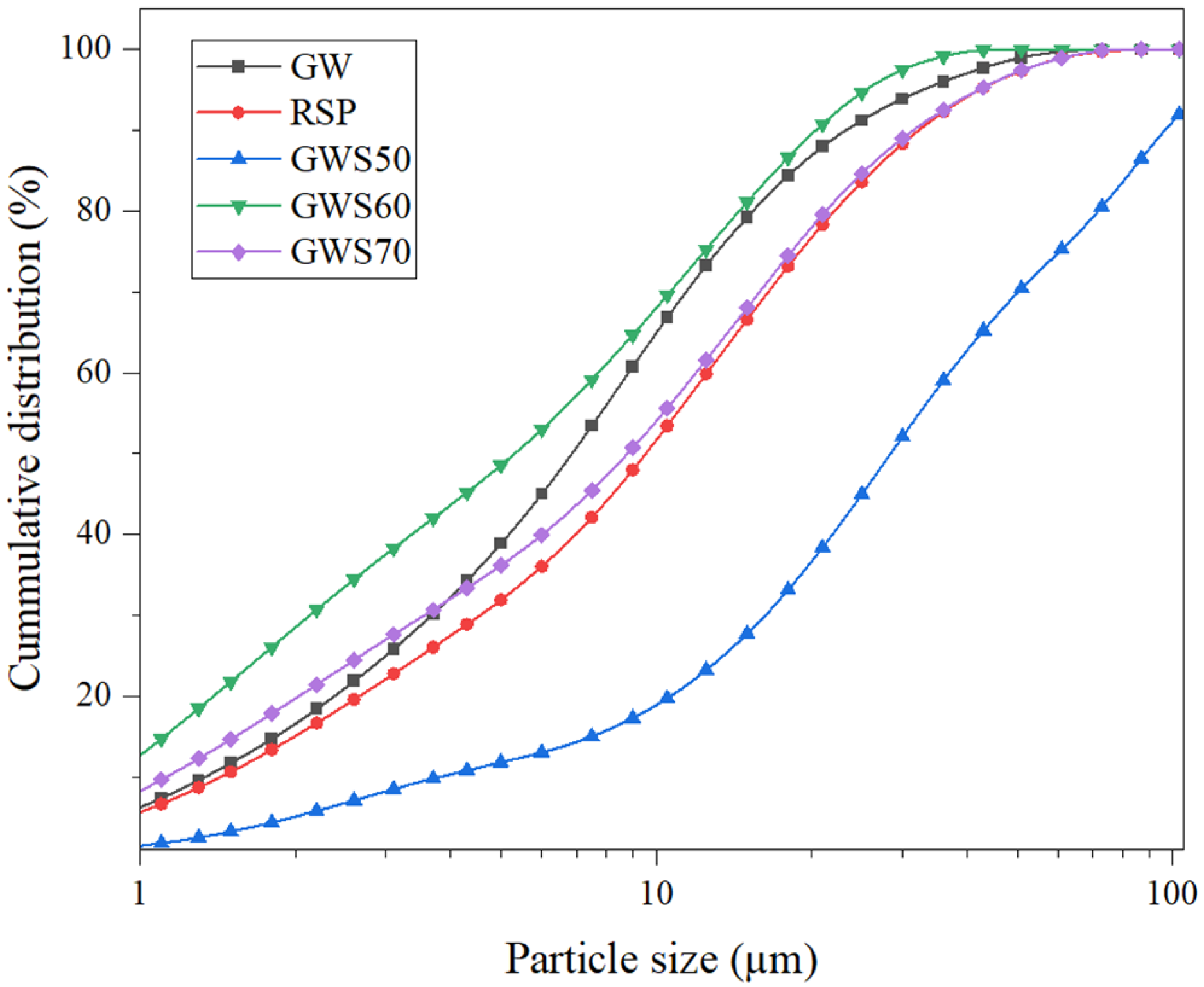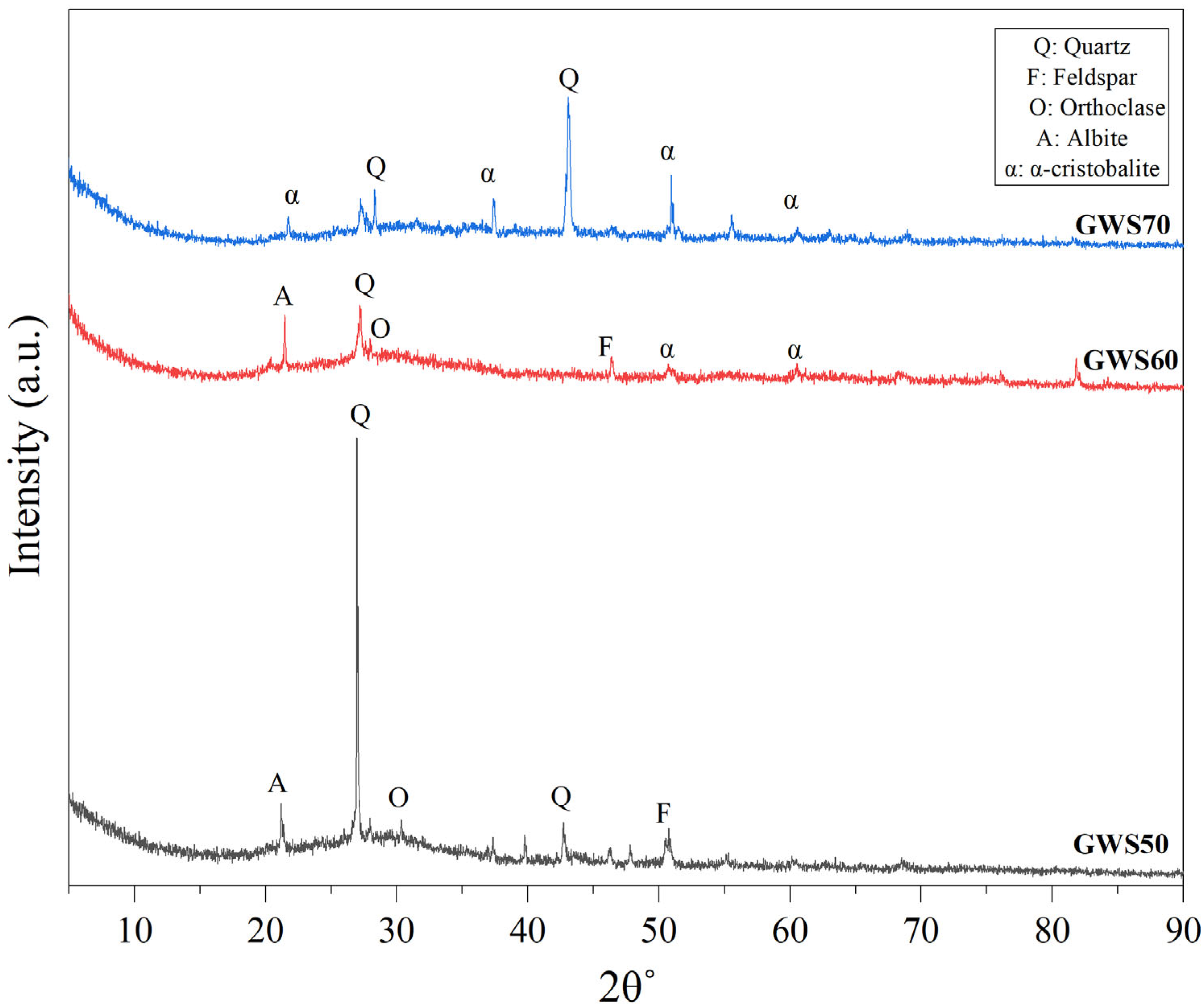 - XRD patterns of GWS mixes revealed that increasing granite waste content from 50 wt% to wt70% enhanced the degree of geopolymerization and alkali gel formation by amplifying the feldspar peaks (orthoclase and albite), resulting in improved chemical stability. However, the higher GW content compromised the mechanical stability and microstructural integrity in GWS70 due to diminished quartz and α-cristobalite phases, leading to weaker bonding. Optimizing GW content from 50 to 60 wt% with reactive silica offered a balanced, sustainable approach for a high-performance alkali-activated mix.