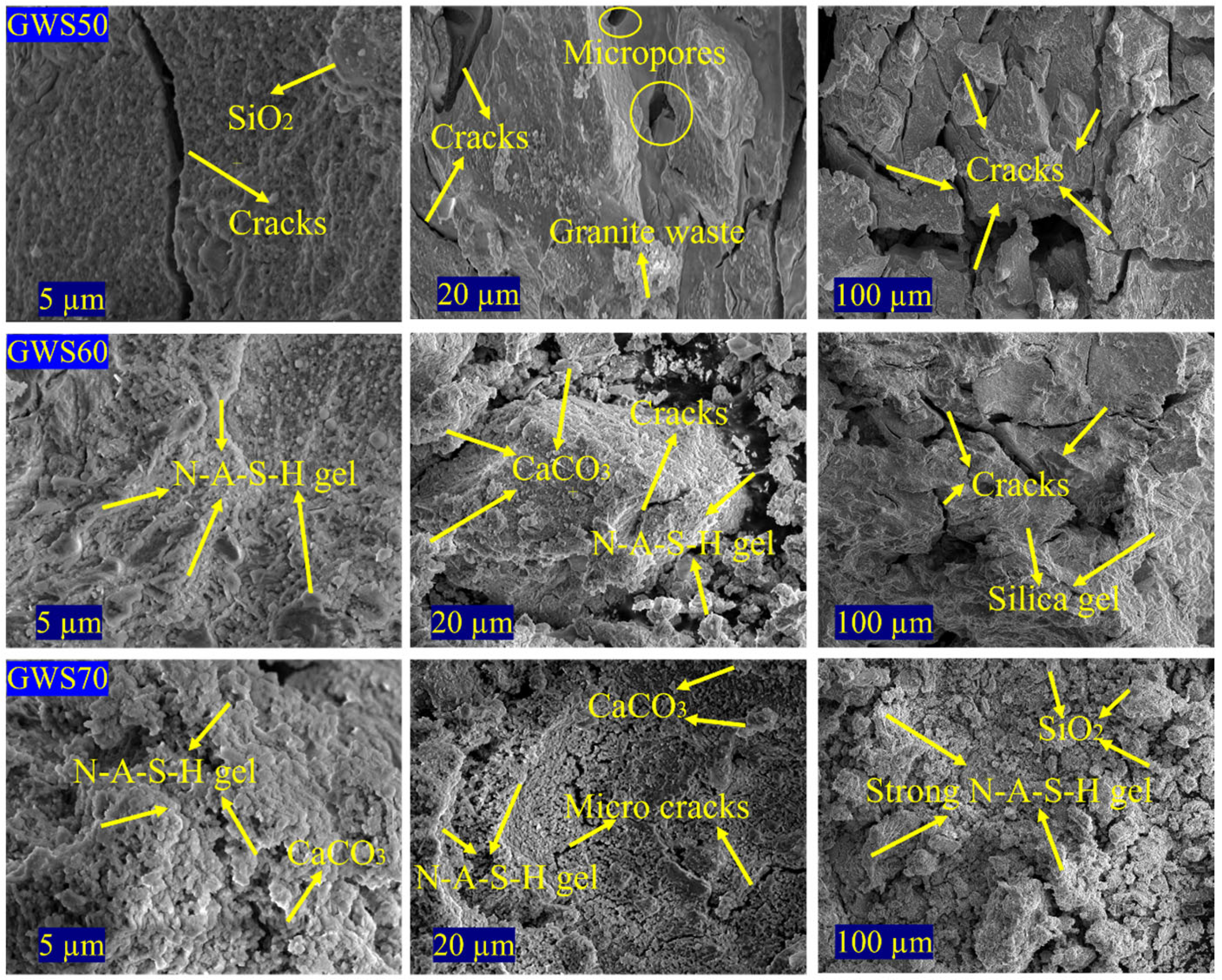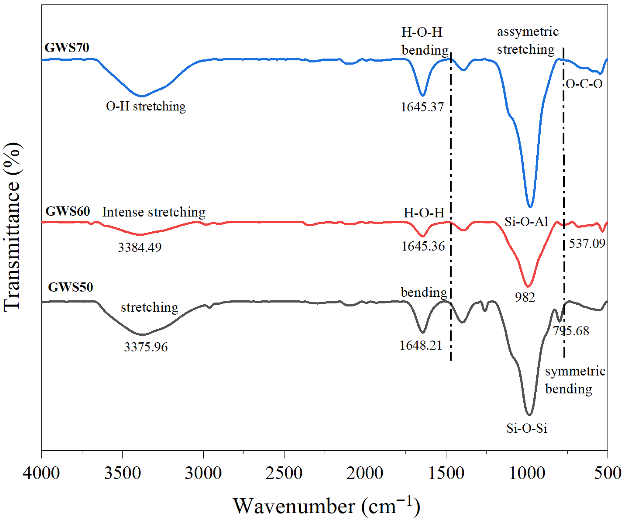 - Functional groups analysis demonstrated that increasing calcined granite waste content significantly weakened Si-O-Si bands while intensifying O-H and H-O-H vibrations, confirming the effect of alkali activators on geopolymerization and shifts in functional groups formation. These alterations transformed the initial silica-rich (GWS50) into highly geopolymerized matrices in GWS60 and GWS70 by increasing chemical reactivity, leading to strong gel formation; however, increased GW content affected the functional performances of GWS mixes noticed from sharp peaks in GWS70.