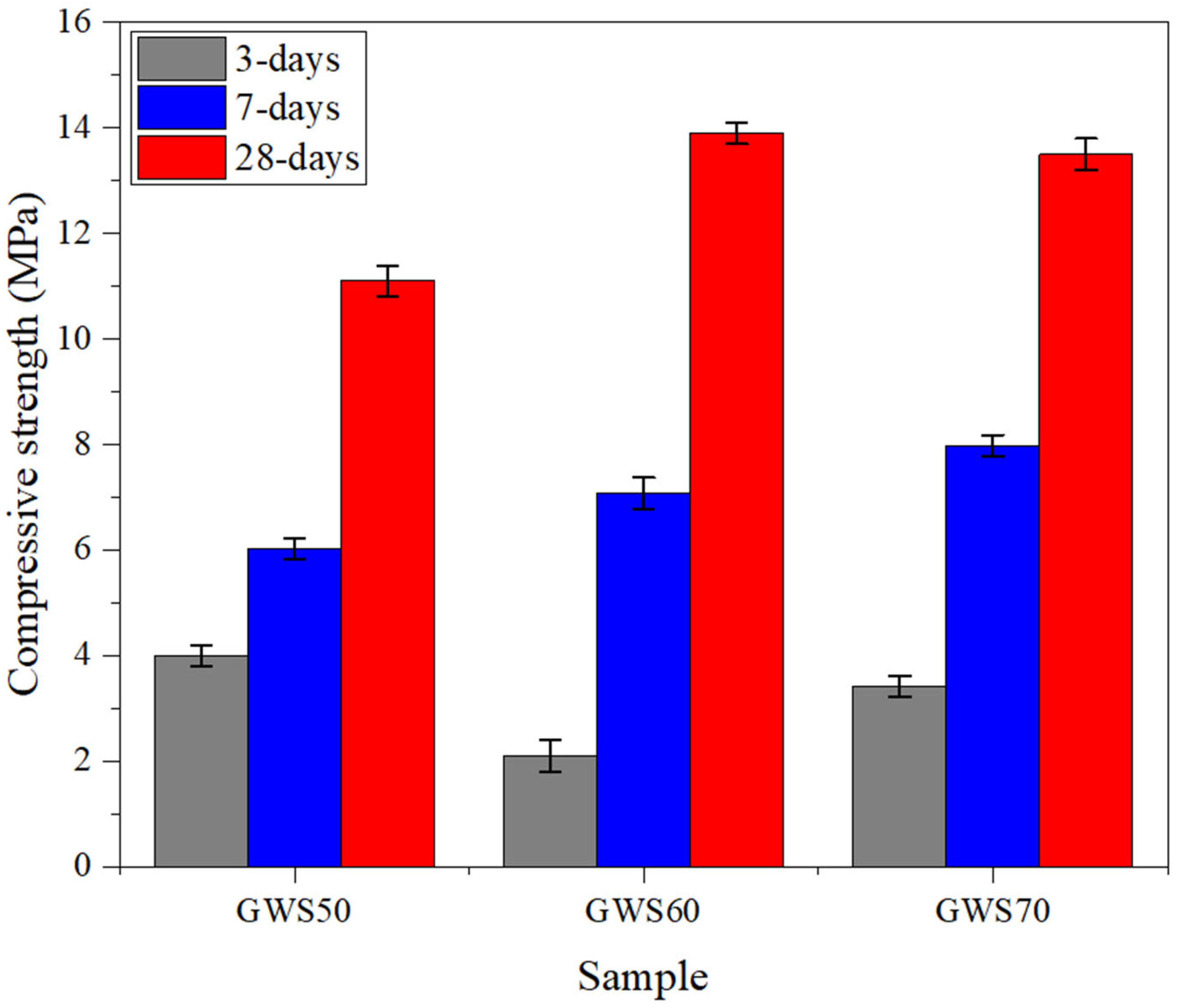 - Compressive strength results showed that GWS60 delivered the highest compressive strength of 14.1 MPa, a 32% increase in strength over GWS50 and GWS70 by achieving the optimal balance of Si/Al ratio promoted the dense N-A-S-H gel formation. GWS50 exhibited faster early strength gain due to excessive reactive silica, while GWS70 exhibited lower strength as compared to GWS60 due to Al/Ca supply effecting the mechanical strength by revealing microcracks on the sample surfaces.