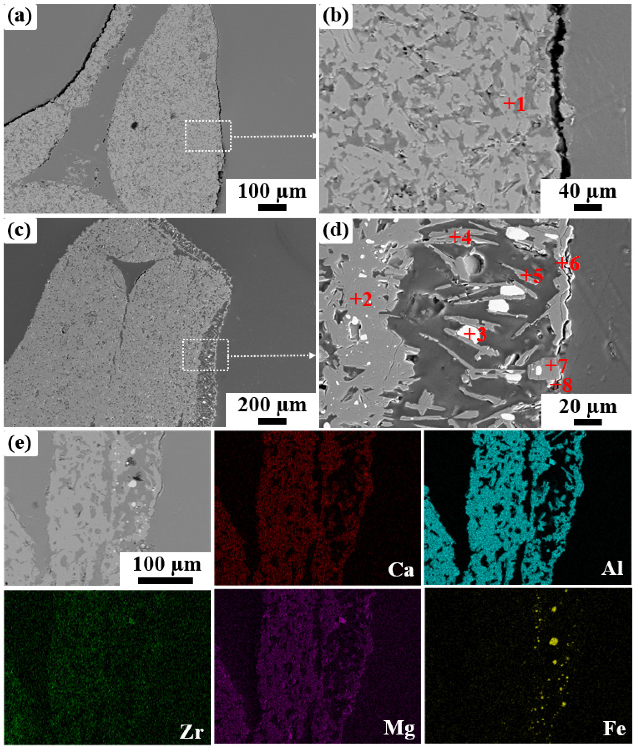- Wu, J.F.; Zhang, C.; Xu, X.H.; Liu, X.; Zhou, S.X.; Wu, C.H. Enhanced thermal shock resistance of ZrO2-reinforced Al2O3-CaAl12O19 composites prepared from ferrotitanium slag: Crack propagation resistance mechanisms. Ceram. Int. 2021, 47, 14540. [Google Scholar] [CrossRef]