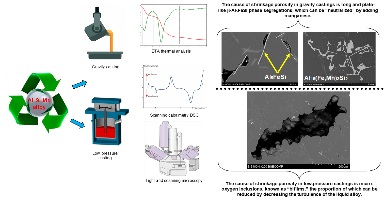 - Demonstrating the possible relationship between increased iron phase content—due to the higher use of charge scrap—and the development of shrinkage porosity in AlSi7Mg0.6 alloy castings. This applies to castings obtained by both gravity and low-pressure methods;
