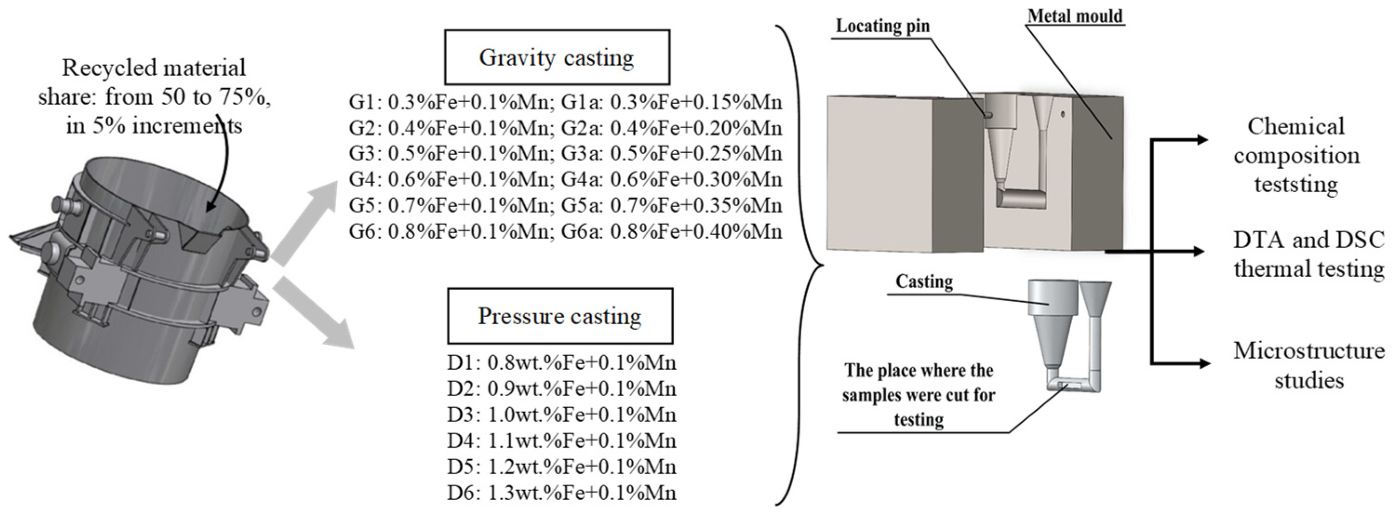 - Gravitational casting into steel molds with increasing iron content from 0.3 wt.% Fe (G1) to 0.8 wt.% Fe (G6) and constant manganese content (approx. 0.1 wt.%);