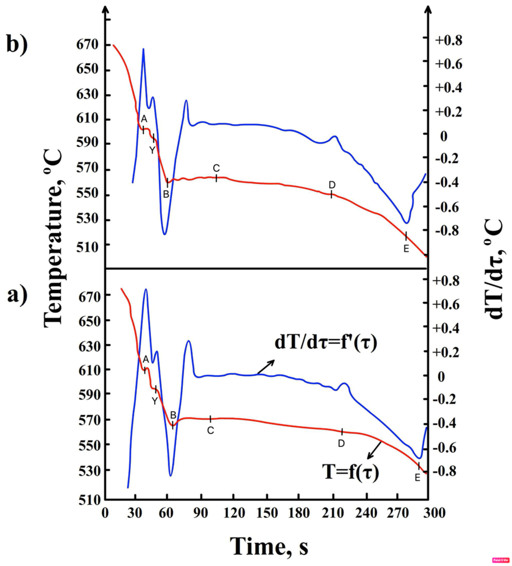 - point E—end temperature of crystallization of the AlSi7Mg0.6 alloy (Tsol.), °C;