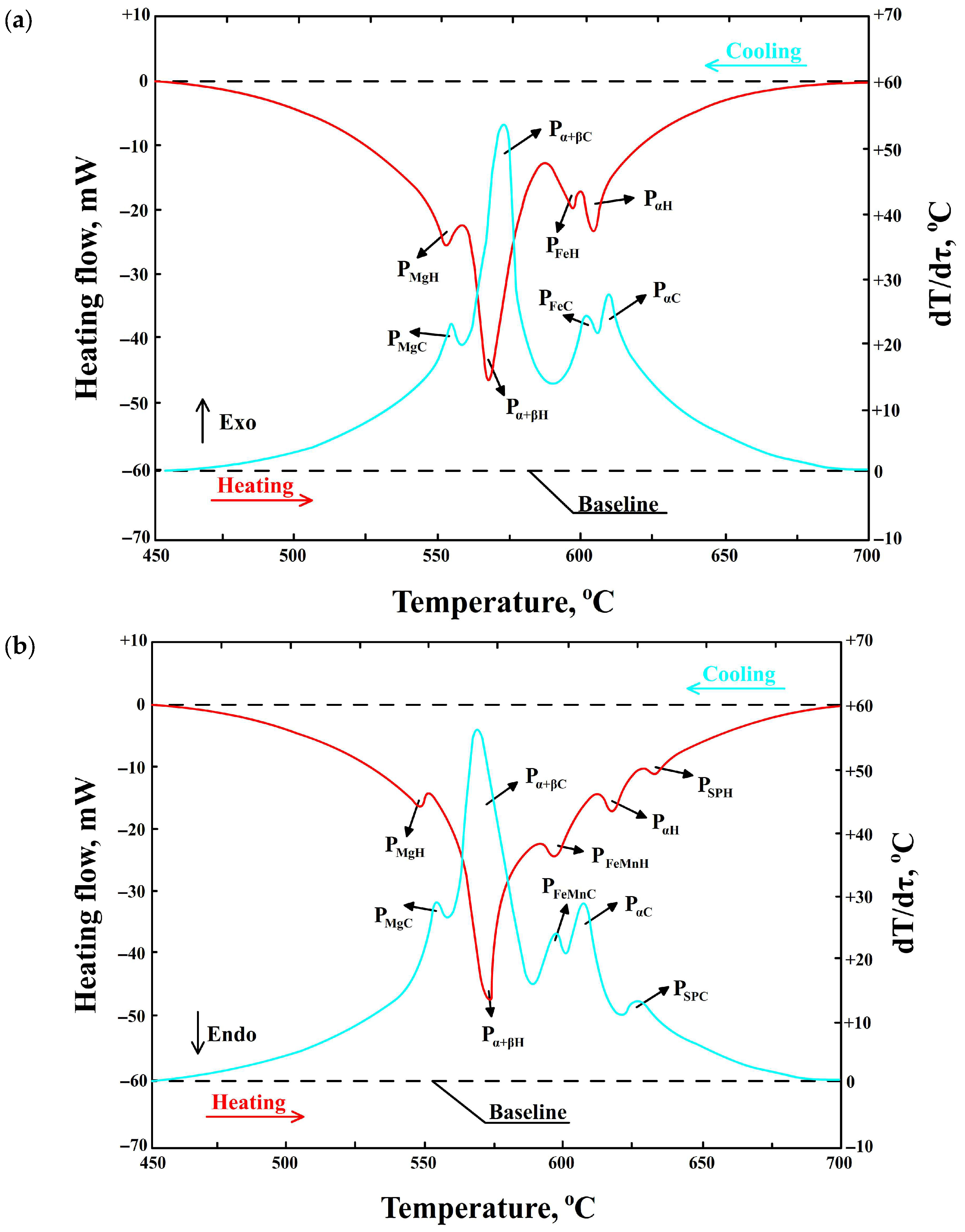 - PFeMnH—thermal effect resulting from the precipitation of the α-Al15(Fe,Mn)3Si2 phase during heating, PFeMnC—during cooling, mW;