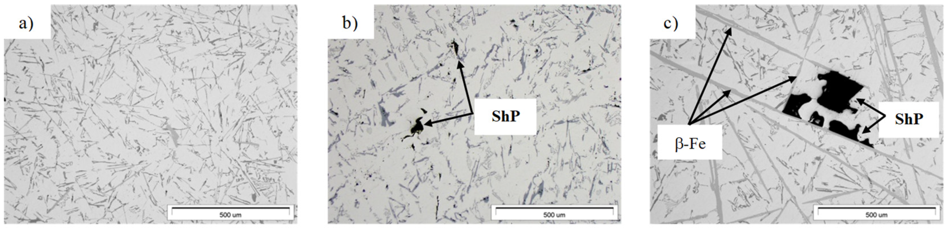 - Mikołajczak, P.; Ratke, L. Three Dimensional Morphology of β-Al5FeSi Intermetallics in AlSi Alloys. Arch. Foundry Eng. 2015, 15, 47–50. [Google Scholar] [CrossRef]