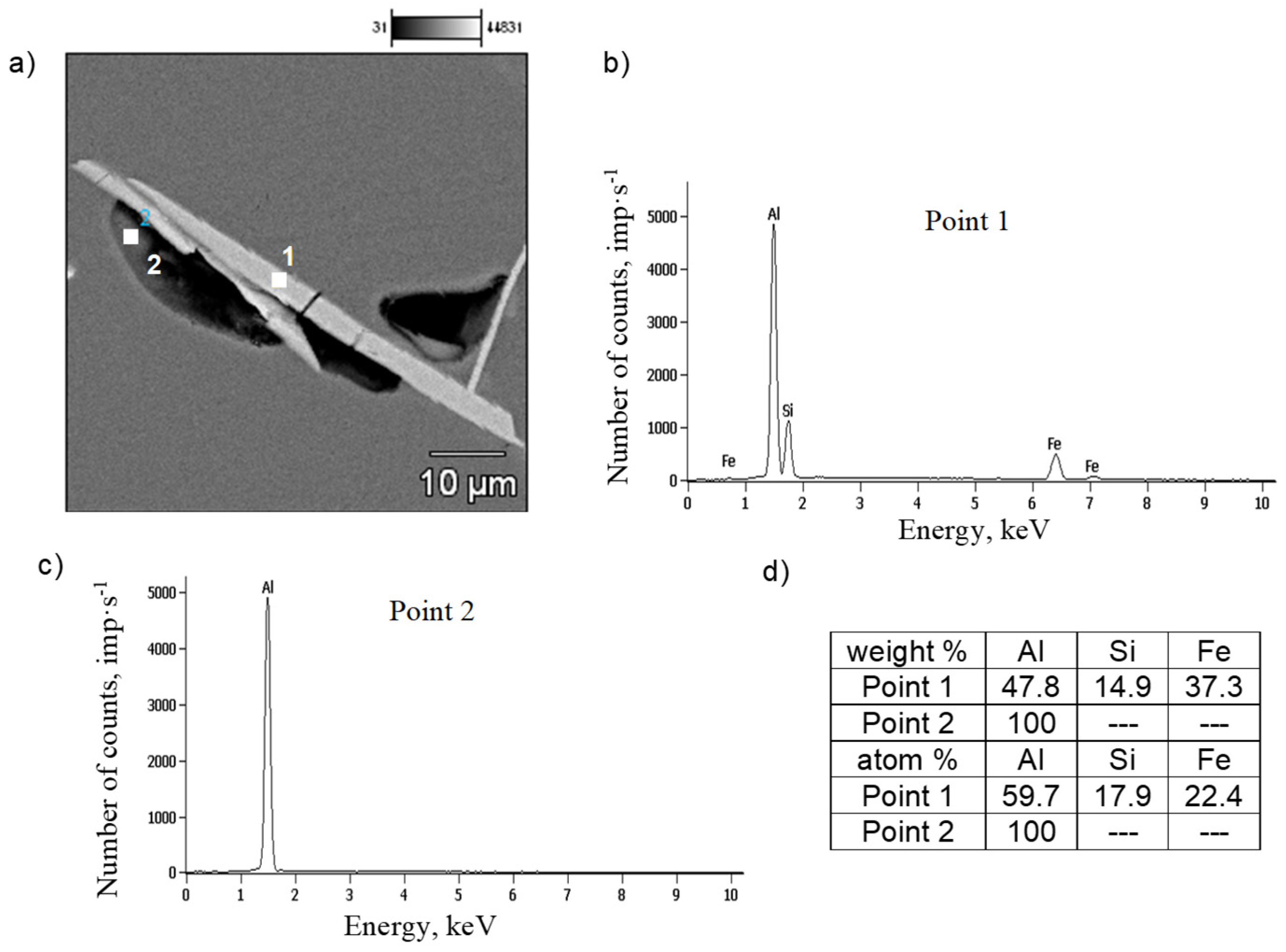 - Increased risk of crystallization: For Fe contents of 0.4 to 0.7 wt.%, the Al5FeSi phase (with a length of approximately 30 to 200 μm) precipitates along the Al(α) dendrites. Above the basic threshold (~0.7 wt.% Fe), this phase crystallizes primarily (reaching a length of 300 to 700 μm).