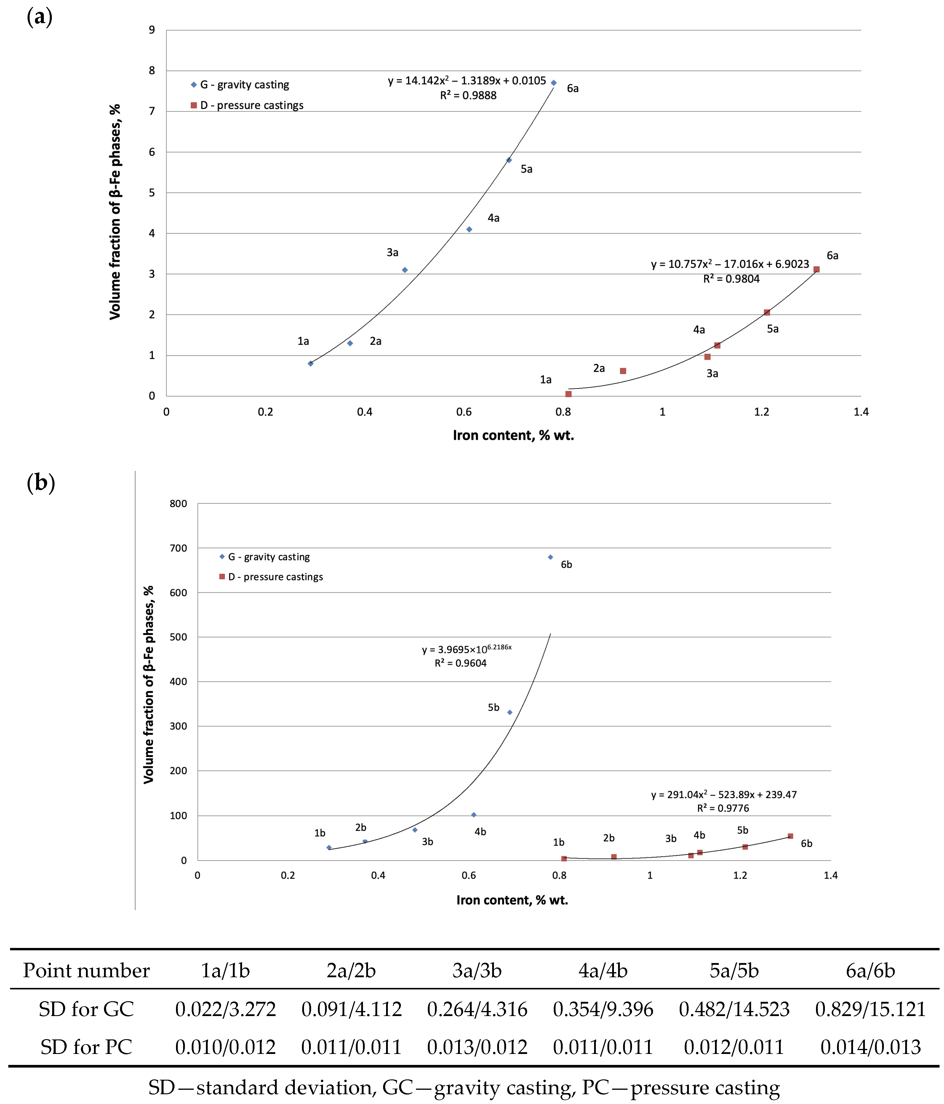 - Gravity with increasing iron content (from 0.3 to 0.8 wt.% Fe) and manganese (Mn/Fe = 1/2)—sample designation from G1a to G6a;