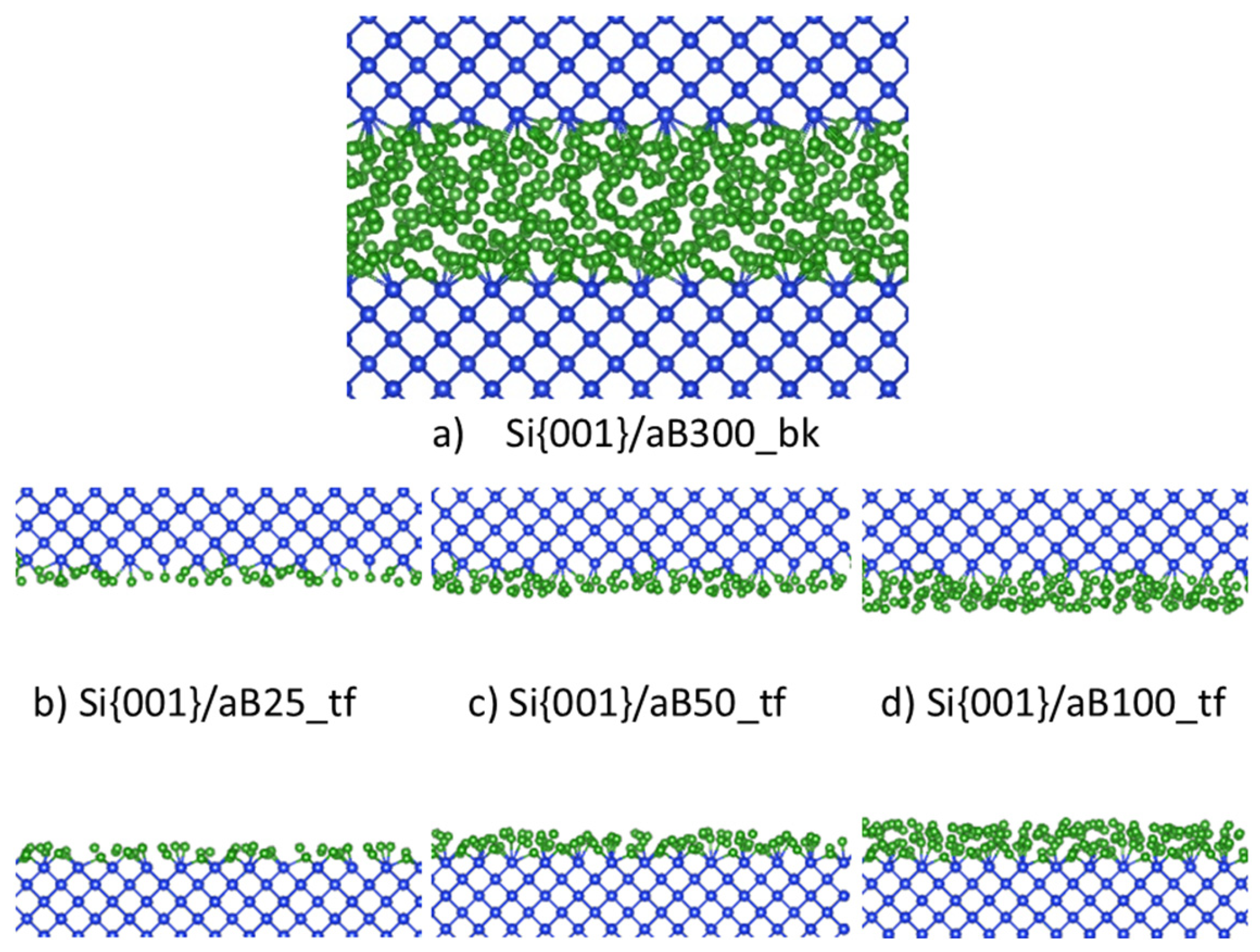 3.2. Local Structures at the a-B/Si{001} Interfaces