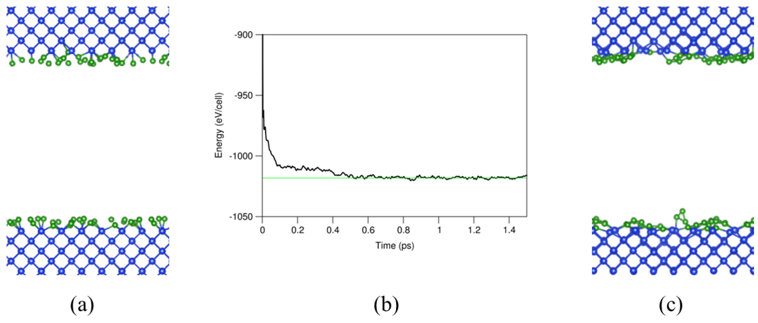 - Weakliem, P.C.; Carter, E.A. Constant temperature molecular dynamics simulations of Si(100) and Ge(100): Equilibrium structure and short-time behavior. J. Chem. Phys. 1992, 96, 3240–3250. [Google Scholar] [CrossRef]