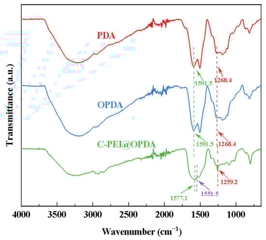 The infrared spectra of PDA, OPDA, and C-PEI@OPDA.
