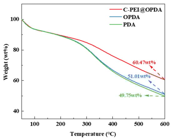 Since the subsequent composite preparation process needs to be conducted under high-temperature conditions, the thermal stability of the polymer coatings was first evaluated by thermogravimetric analysis (TGA). Figure 5 shows the thermal stability curves of PDA, OPDA, and C-PEI@OPDA in the temperature range of 50 °C to 600 °C. The results indicate that at 600 °C, the mass residual rates of PDA, OPDA, and C-PEI@OPDA were 49.75 wt%, 51.01 wt%, and 60.47 wt%, respectively. All samples exhibited varying degrees of mass loss, which can be attributed to the desorption of water molecules and the decomposition of aromatic rings, –OH, –COOH, and C=O groups in the polymer backbone at elevated temperatures. The mass residual rate of OPDA was slightly higher than that of PDA, which may be because the ultrasonic treatment process increased the degree of polymerization of OPDA, thereby improving its thermal resistance. PEI is a branched polymer containing abundant –NH2 groups, and the primary amines in its molecular chains possess high reactivity. Compared with PDA and OPDA, C-PEI@OPDA exhibited superior thermal stability because the primary amines in PEI can react with the double bond intermediates and quinone groups generated during the DA oxidation process to form chemical bonds, thereby increasing the crosslinking density of C-PEI@OPDA. The highly crosslinked structure restricts the movement of C-PEI@OPDA molecular chain segments, which means that higher energy is required to destroy this crosslinked structure. Therefore, the thermal stability of C-PEI@OPDA was significantly enhanced.
