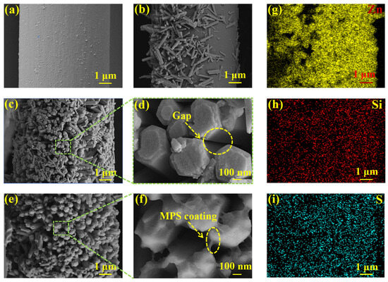 As shown in Figure 6a, after the deposition of the C-PEI@OPDA coating, a distinct polymer coating was formed on the CF@E-OP surface, which provided abundant active sites for ZW growth. As shown in Figure 6b, ZW grown on the carbon fiber surface without C-PEI@OPDA coating modification exhibited sparse distribution and disordered arrangement. However, when ZW was grown on the carbon fiber surface using the C-PEI@OPDA coating as a growth template, as shown in Figure 6c,d, nanorods were observed to be regularly and vertically aligned on the carbon fiber surface with gaps between the rods. The reason for the above morphological differences lies in the fact that the C-PEI@OPDA coating contains abundant polar groups such as –OH and –NH2, which can adsorb Zn2+ and promote uniform nucleation, thereby inducing preferential growth of ZW in the vertical direction. In contrast, without the C-PEI@OPDA coating as a growth template, the surface chemical properties of the carbon fiber were unfavorable for regular ZnO nucleation, resulting in disordered ZW growth. As shown in Figure 6e,f, the MPS coating was observed on the ZW surface and in the interstices of CF@E-OP/ZWS. The corresponding elemental mapping results are shown in Figure 6g–i, and the results of CF@E-OP/ZWS showed distinct distribution signals of Zn, Si, and S elements, which further confirmed that ZW and MPS were successfully loaded onto the carbon fiber surface.
