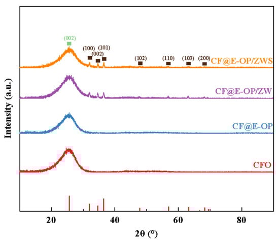 As shown in Figure 7, all samples exhibited a sharp diffraction peak at 2θ = 25.5°, which corresponds to the (002) crystal plane of the graphitized structure on the carbon fiber surface. For CF@ZW, a series of weak diffraction peaks were observed at 2θ = 31.9°, 34.6°, 36.4°, 47.8°, 56.9°, 63.2°, and 66.7°, which correspond to the (100), (002), (101), (102), (110), (103), and (200) crystal planes of the ZnO hexagonal wurtzite phase, respectively, indicating that ZW was deposited on the carbon fiber surface [42,43]. Compared with CF@ZW, the intensity of the ZnO diffraction peaks in CF@E-OP/ZW increased, indicating that using the C-PEI@OPDA coating as a growth template can promote ZW growth on the carbon fiber surface, thereby increasing the loading amount of ZW on the fiber surface. After further grafting MPS onto the CF@E-OP/ZW surface to obtain CF@E-OP/ZWS, the characteristic diffraction peak intensity of ZnO on the carbon fiber surface did not change significantly compared with CF@E-OP/ZW, indicating that the MPS grafting process does not affect the crystal structure of ZW on the carbon fiber surface.