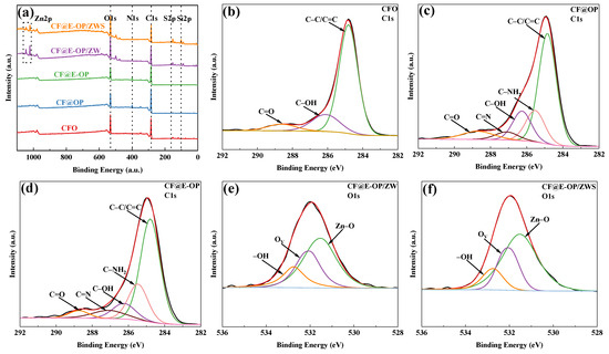 (a) XPS survey spectra of CFO, CF@OP, CF@E-OP, CF@E-OP/ZW, and CF@E-OP/ZWS, (b) CFO, (c) CF@OP, (d) CF@E-OP C1s peak-fitted XPS spectra, (e) CF@E-OP/ZW, and (f) CF@E-OP/ZWS O1s peak-fitted XPS spectra.
