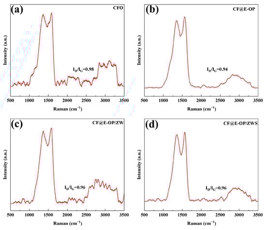 Raman spectra of (a) CFO, (b) CF@E-OP, (c) CF@E-OP/ZW, and (d) CF@E-OP/ZWS.