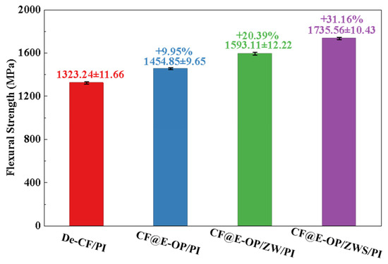 Flexural strength reflects the overall load-bearing capacity of materials under bending loads. As shown in Figure 13, compared with De-CF/PI, the flexural strength of CF@E-OP/PI increased by 9.95%. This improvement benefits from the abundant hydrogen bonding interactions and dense resin crosslinked network in the interfacial layer, both of which constructed a stable interfacial layer. When the material is subjected to bending loads, external stress can be effectively transferred from the resin matrix through the interfacial layer to the carbon fiber, thereby improving the flexural strength of the composites. Compared with De-CF/PI, the flexural strength of CF@E-OP/ZW/PI increased by 20.39%, which is attributed to the micro-nano scale rough structures constructed by ZW on the carbon fiber surface. During the composite molding process, the molten resin penetrated into the ZW gaps and formed mechanical interlocking with the carbon fiber after curing. This strong anchoring effect can improve the stress transfer efficiency from resin to carbon fiber. Furthermore, during the process of the composite bearing bending loads, ZW can impede and deflect cracks at the interface, which increases the energy required for interfacial failure. On the basis of the aforementioned modifications, MPS was further grafted onto the carbon fiber surface. Compared with De-CF/PI, the flexural strength of the prepared CF@E-OP/ZWS/PI increased by 31.16%. This is attributed to the fact that the introduction of covalent bonds further improved the interfacial bonding strength between carbon fiber and PI, thereby enhancing the overall load-bearing capacity of the composites.
