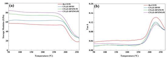 (a) Storage modulus and (b) loss factor of De-CF/PI, CF@E-OP/PI, CF@E-OP/ZW/PI and CF@E-OP/ZWS/PI.