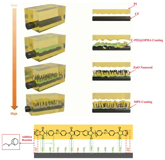 Due to the non-polar and chemically inert nature of carbon fiber surfaces, the interfacial bonding strength between carbon fibers and norbornene-polyimide (PI-NA) resin matrix is relatively weak. To address this issue, this study constructed a composite coating on the carbon fiber surface and proposed a novel method to build robust interfaces based on multiple interfacial interactions, thereby effectively enhancing the interfacial properties between carbon fibers and PI-NA resin. Inspired by mussel adhesive proteins, this study established a multi-level synergistic interfacial reinforcement system by sequentially constructing a C-PEI@OPDA coating, in situ growing zinc oxide nanorods (ZW) arrays, and grafting 3-mercaptopropyltrimethoxysilane (MPS) onto carbon fiber surfaces. The C-PEI@OPDA coating, rich in amino (–NH2) and hydroxyl groups (–OH), enhanced adhesion to carbon fibers and adsorbed Zn2+ via coordination interactions to provide nucleation sites for ZW growth. Meanwhile, the active hydrogen in the coating promoted the crosslinking of PI-NA resin, thereby increasing the resin crosslinking density in the interfacial region. The vertically aligned ZW significantly increased surface roughness, enhanced mechanical interlocking effects, and provided secondary reaction sites for MPS grafting. The thiol groups (–SH) in MPS formed covalent bonds with PI-NA resin through thiol-ene click reactions, further strengthening interfacial bonding. The results showed that the ILSS, IFSS, and flexural strength of C-PEI@OPDA/ZW/MPS modified carbon fiber composites reached 75.15 MPa, 102.93 MPa, and 1735.56 MPa, representing improvements of 39.09%, 48.79%, and 31.16%, respectively. This study effectively enhanced the carbon fiber-reinforced polymer composites interfacial bonding strength through the synergistic effects of hydrogen bonding, mechanical interlocking, chemical bonding, and increased resin crosslinking density.