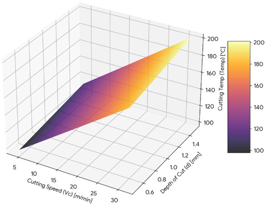 The surface exhibits a clear upward curvature along the cutting speed axis, confirming the presence of a significant quadratic effect. The inclined plane formed by the combined increase in cutting speed and depth of cut indicates interaction between these parameters. The gradient along the cutting speed direction is steeper than that along the depth of cut, reflecting greater sensitivity of temperature to variations in cutting speed.
