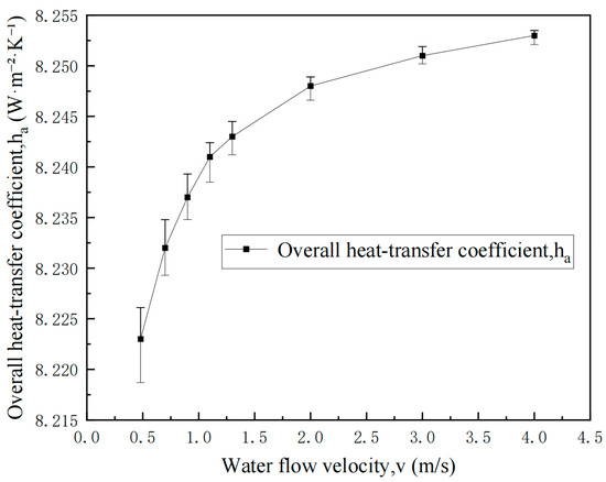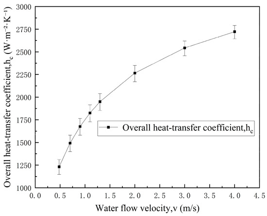 To visualize the uncertainty of the calculated , error bars were obtained by a one-at-a-time perturbation of the water-side convection coefficient . Specifically, was calculated using the Dittus–Boelter correlation for turbulent flow and then varied by ±10% to represent the typical scatter of empirical correlations and input property uncertainty. For each flow velocity condition, three deterministic calculations (baseline, × 0.9, and × 1.1) were performed, and the resulting bounds of propagated through the series thermal resistance relation are reported as the error bars in Figure 3.