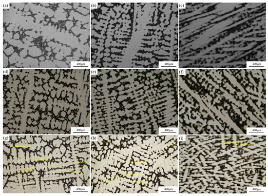 Dendritic structure of the IN718 VAR ingots: (a) center at low flow rate; (b) R/2 at low flow rate; (c) edge at low flow rate; (d) center at medium flow rate; (e) R/2 at medium flow rate; (f) edge at medium flow rate; (g) center at high flow rate; (h) R/2 at high flow rate; (i) edge at high flow rate. The yellow dashed lines are guides for secondary dendrite arm spacing (SADS) measurements; the quantitative SADS results are provided in the text/table.